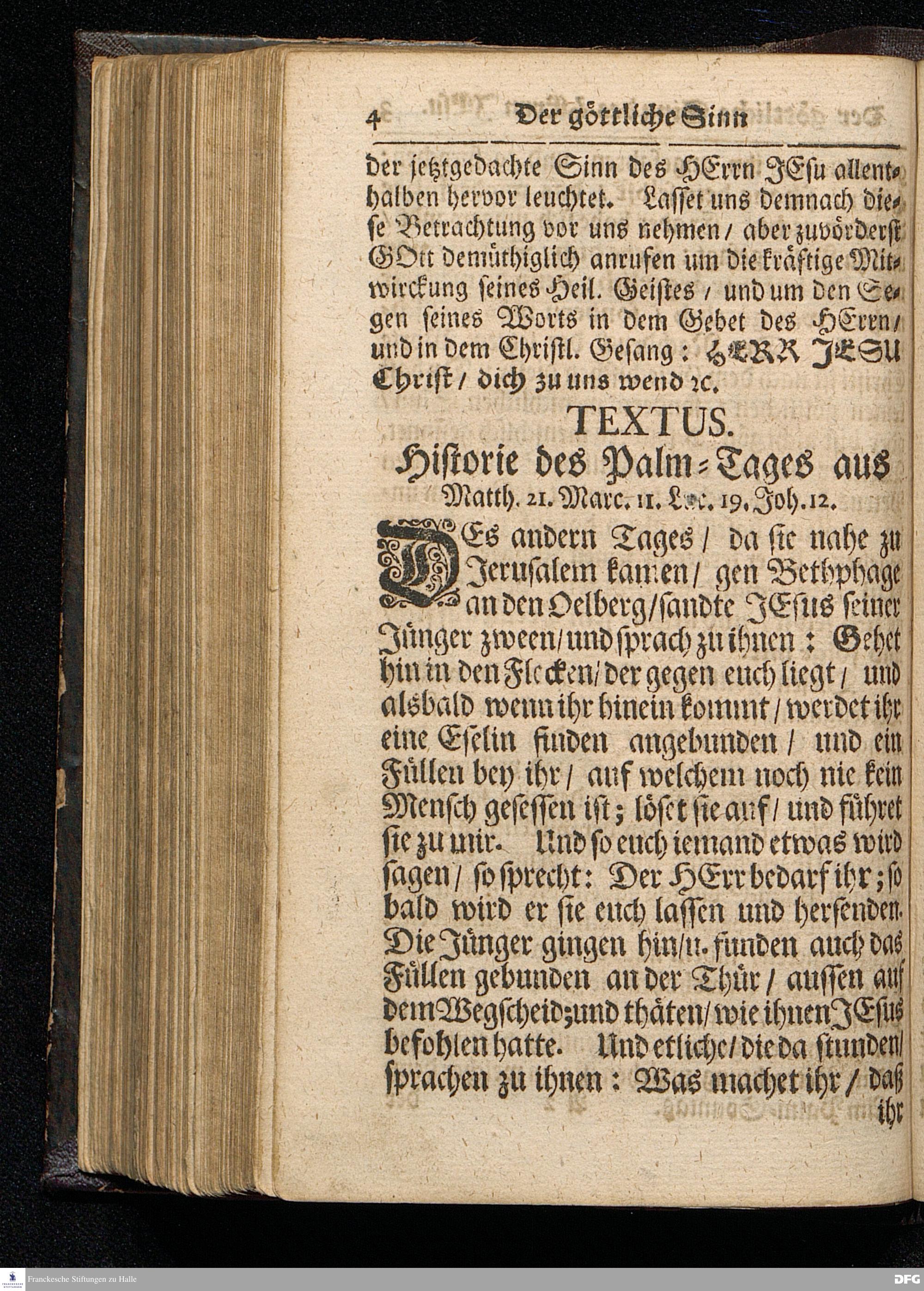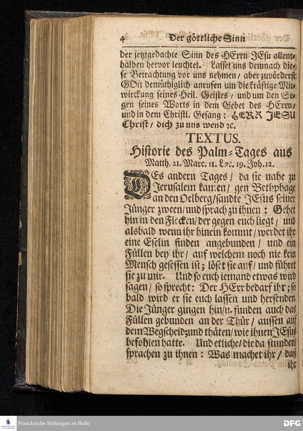 Der Göttliche Sinn des HErrn JEsu / Wie derselbe vor der Antretung seines Leidens aus der Historia des Palm=Tages zu erkennen ist / Auf Palmarum MDCCXVI. In der St.Ulrichs=Kirchen in Halle vorgestellet von August Hermann Francken / S.Theol.Prof.& Past.zu S.Ulrich / und des Gymnasii Scholarcha. HALLE / Gedruckt und zu finden im Wäysen=Hause. 1716.