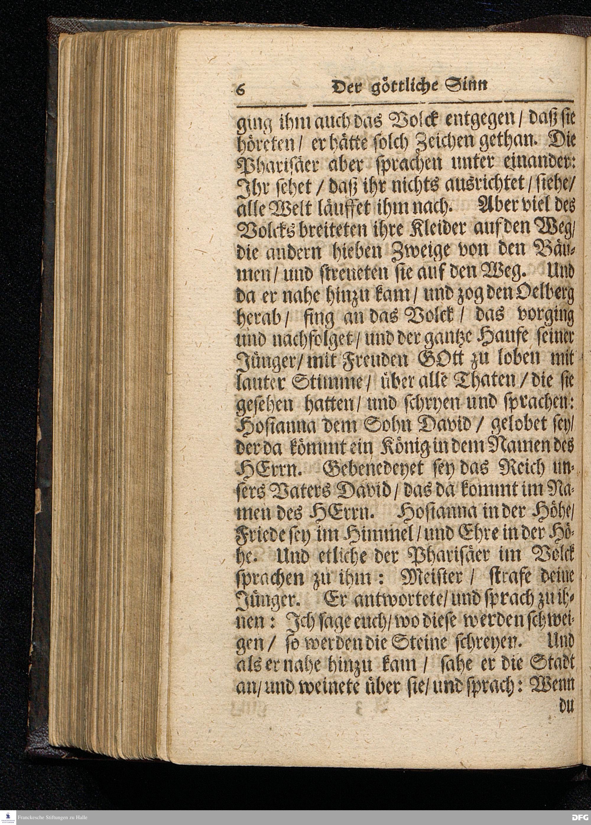 Der Göttliche Sinn des HErrn JEsu / Wie derselbe vor der Antretung seines Leidens aus der Historia des Palm=Tages zu erkennen ist / Auf Palmarum MDCCXVI. In der St.Ulrichs=Kirchen in Halle vorgestellet von August Hermann Francken / S.Theol.Prof.& Past.zu S.Ulrich / und des Gymnasii Scholarcha. HALLE / Gedruckt und zu finden im Wäysen=Hause. 1716.