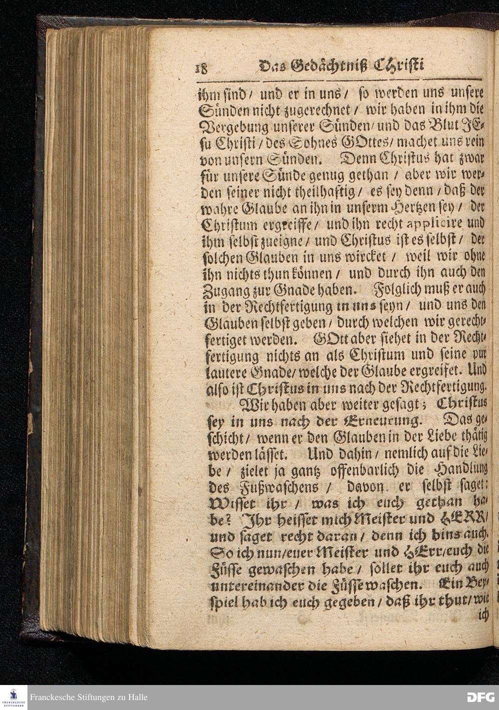 Das Gedächtniß CHristi für uns und in uns / Am Grünen Donnerstage 1716. Aus der Evangelischen Historie Von der Einsetzung des Heil.Abendmahls / und vom Fuß=Waschen CHristi / In der St.Ulrichs=Kirchen in Halle angewiesen von August Hermann Francken / S.Theol.Prof.& Past.zu S.Ulrich / und des Gymnasii Scholarcha. HALLE / Gedruckt und zu finden im Wäysen=Hause. 1716.
