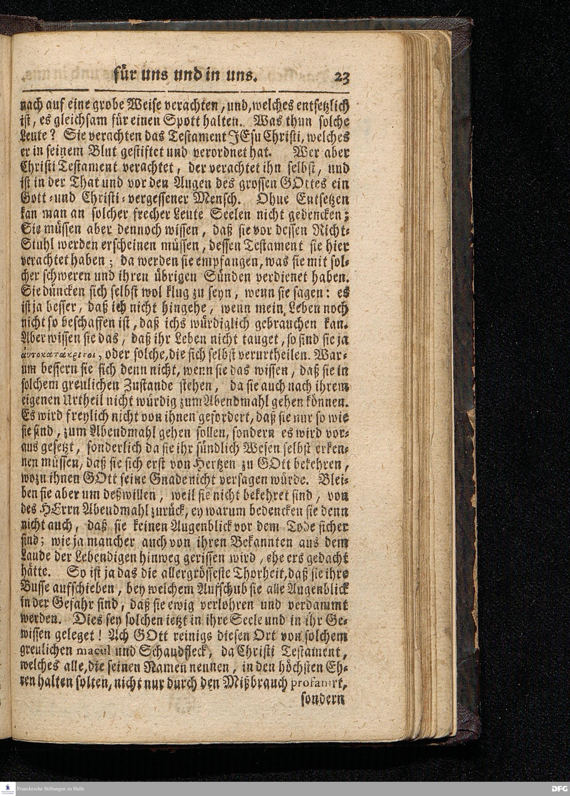 Das Gedächtniß CHristi für uns und in uns / Am Grünen Donnerstage 1716. Aus der Evangelischen Historie Von der Einsetzung des Heil.Abendmahls / und vom Fuß=Waschen CHristi / In der St.Ulrichs=Kirchen in Halle angewiesen von August Hermann Francken / S.Theol.Prof.& Past.zu S.Ulrich / und des Gymnasii Scholarcha. HALLE / Gedruckt und zu finden im Wäysen=Hause. 1716.