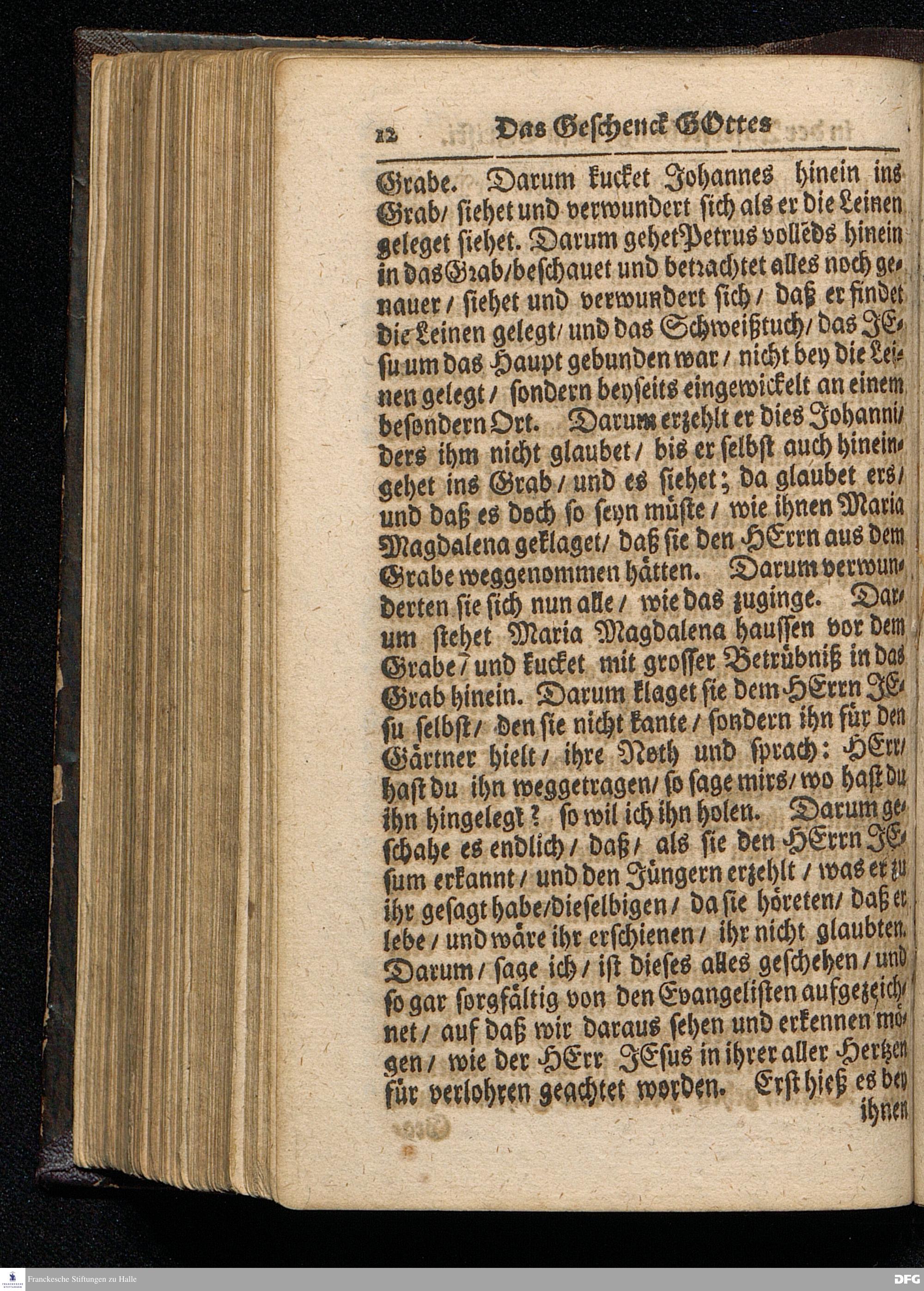 Das Geschenck GOttes In der Auferstehung JESU CHristi / Aus dem Anfang der Historie der Auferstehung JEsu CHristi Nach allen 4.Evangelisten Am Isten Oster=Feyertage In der St.Ulrichs=Kirchen in Halle angewiesen von August Hermann Francken / S.Theol.Prof.& Past.zu S.Ulrich / und des Gymnasii Scholarcha. HALLE / Gedruckt und zu finden im Wäysen=Hause 1716.
