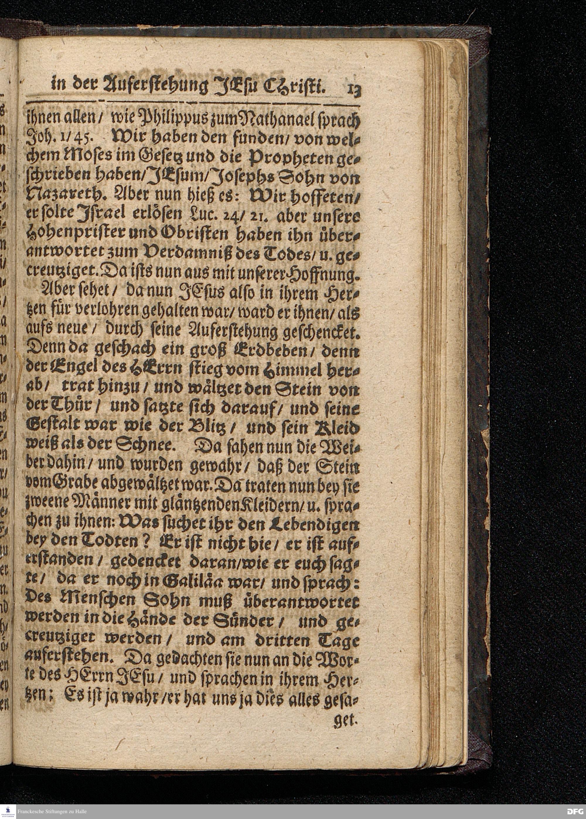 Das Geschenck GOttes In der Auferstehung JESU CHristi / Aus dem Anfang der Historie der Auferstehung JEsu CHristi Nach allen 4.Evangelisten Am Isten Oster=Feyertage In der St.Ulrichs=Kirchen in Halle angewiesen von August Hermann Francken / S.Theol.Prof.& Past.zu S.Ulrich / und des Gymnasii Scholarcha. HALLE / Gedruckt und zu finden im Wäysen=Hause 1716.