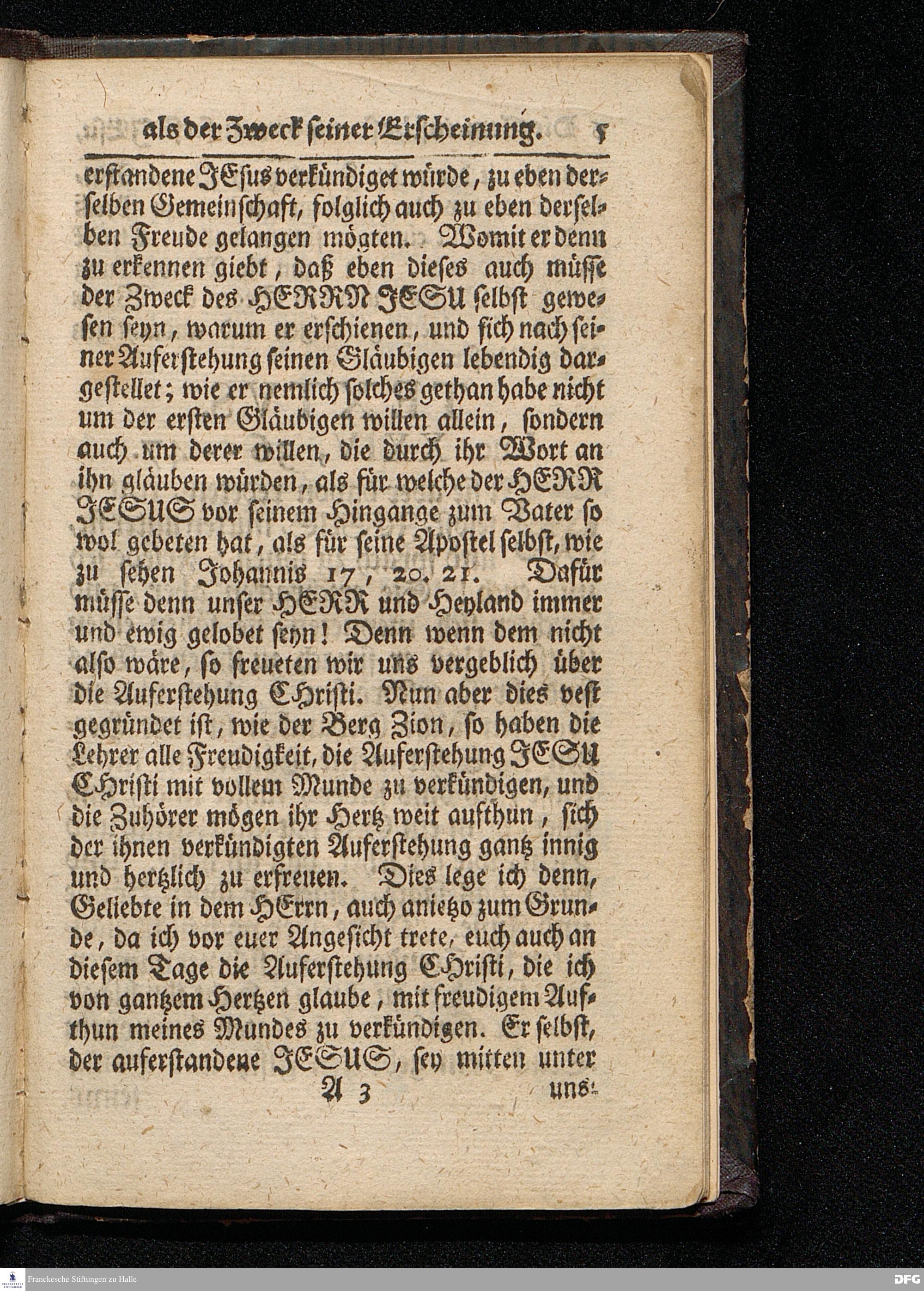 Die Gemeinschaft mit dem auferstandenen JEsu / Als Der Zweck seiner Erscheinung / Am 3ten Oster=Feyertage MDCCXVI. Aus dem Evangelio Luc.XXIV, 36--47. In der Schul=Kirche zu Halle vorgestellet von August Hermann Francken / S.Theolog.Prof.& Past.zu S.Ulrich, und des Gymnasii Scholarcha. HALLE, Gedruckt und zu finden im Wäysen=Hause. Anno 1716.
