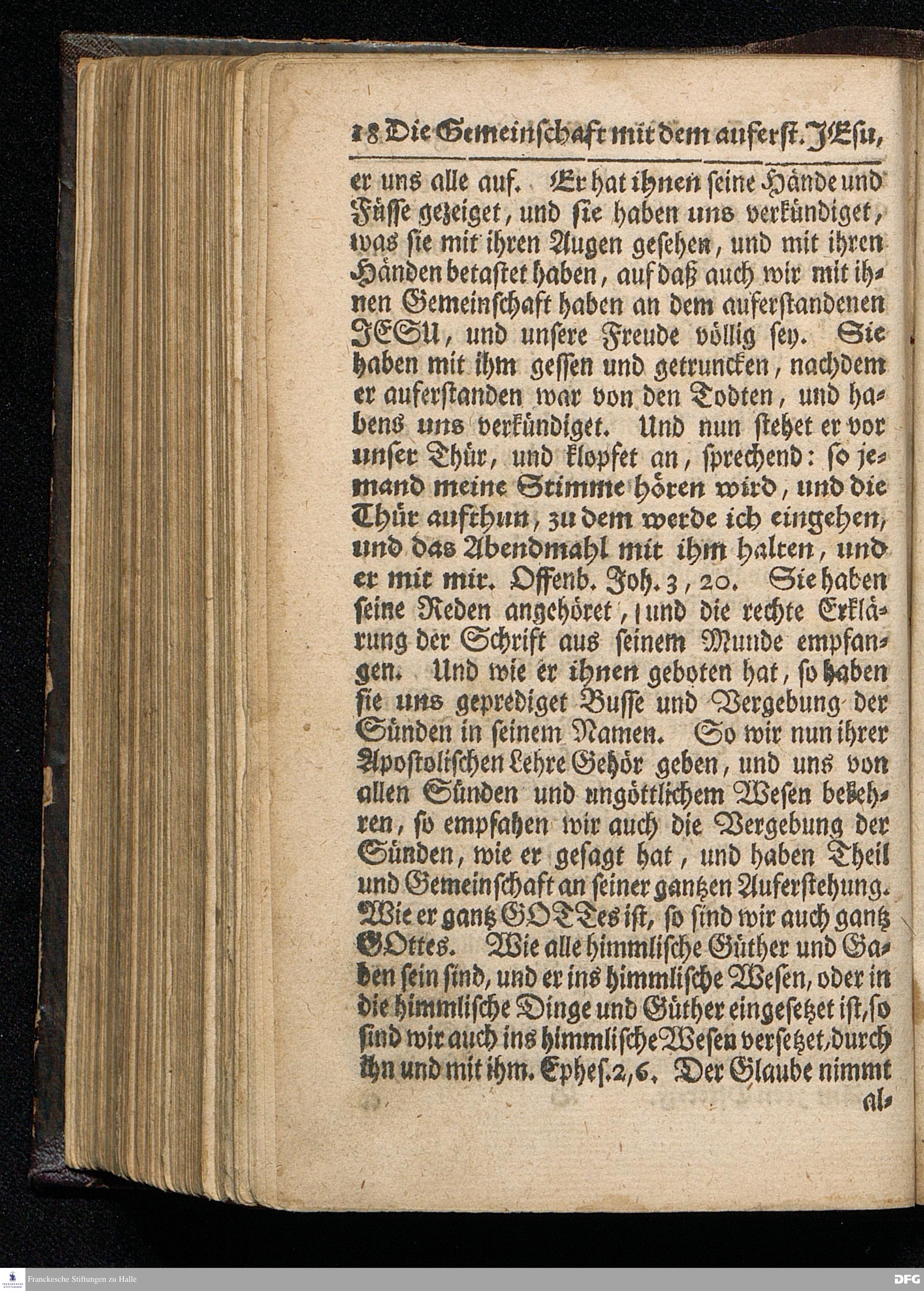 Die Gemeinschaft mit dem auferstandenen JEsu / Als Der Zweck seiner Erscheinung / Am 3ten Oster=Feyertage MDCCXVI. Aus dem Evangelio Luc.XXIV, 36--47. In der Schul=Kirche zu Halle vorgestellet von August Hermann Francken / S.Theolog.Prof.& Past.zu S.Ulrich, und des Gymnasii Scholarcha. HALLE, Gedruckt und zu finden im Wäysen=Hause. Anno 1716.