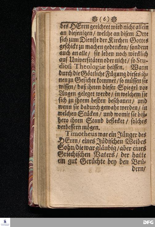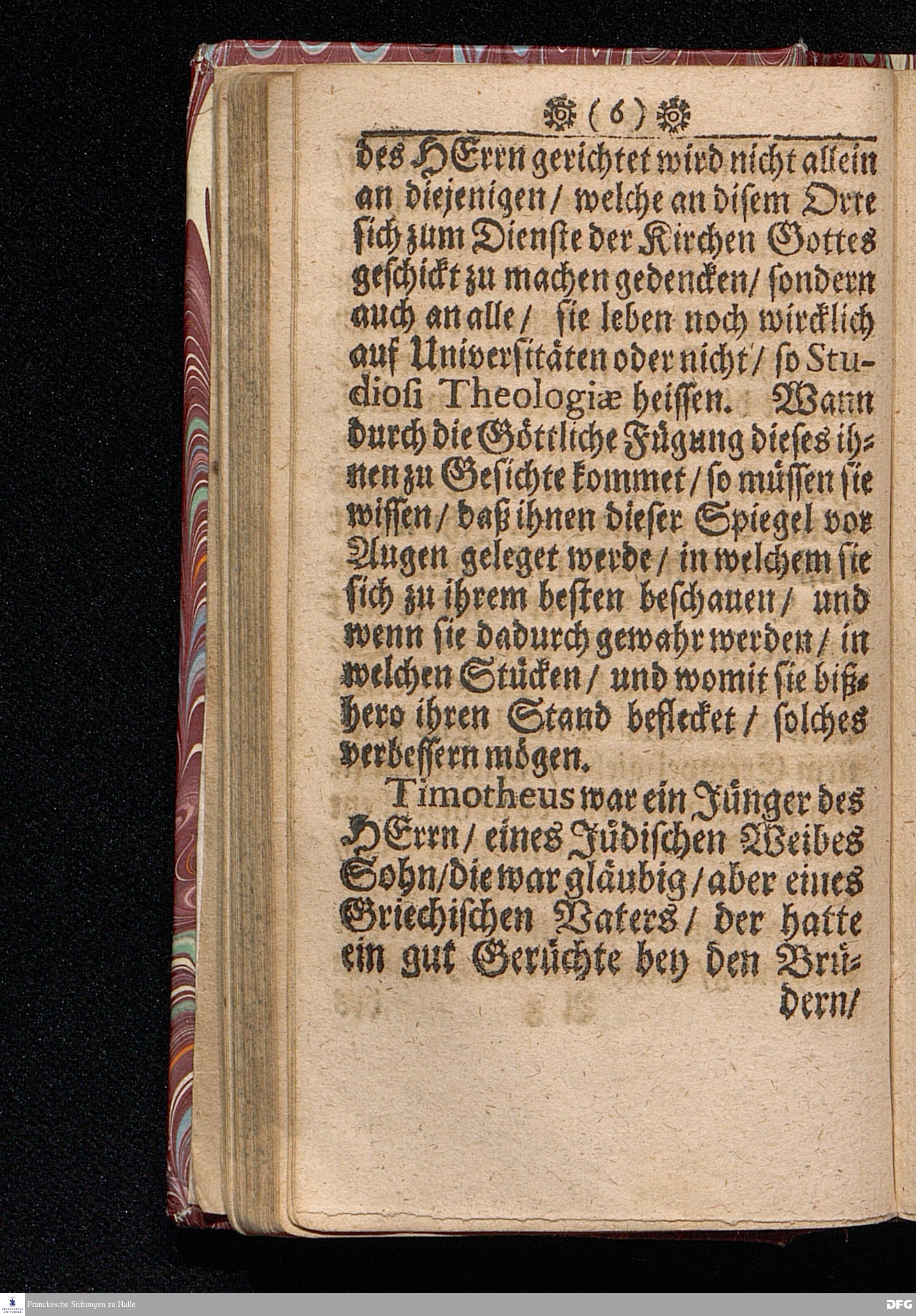 Timotheus Zum Fürbilde Allen Theologiæ Studiosis dargestellet von M.Aug.Hermann Francken / Gr.& Or.Lingg.P.P.& P.Glauch. Editio secunda & auctior. [Bibelzitat.] Halle / verlegts Joh.Friedrich Zeitler. 1695.