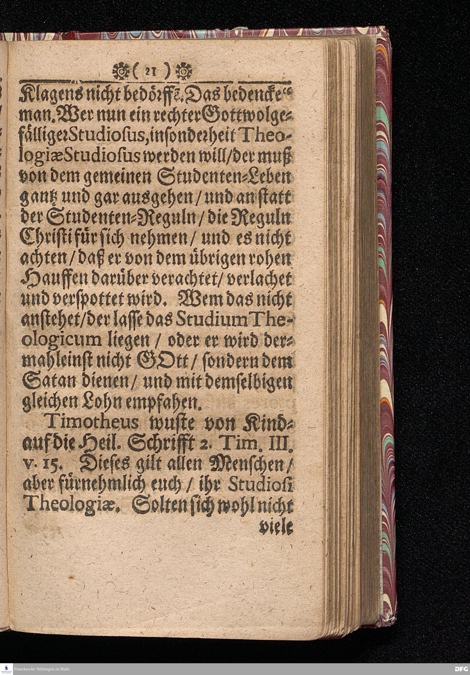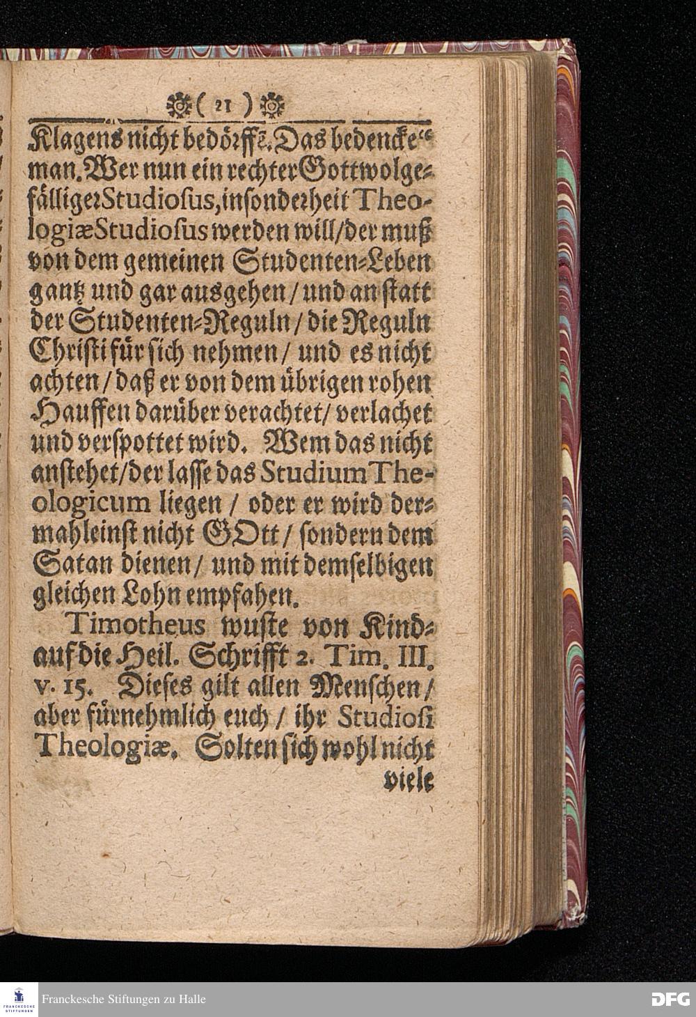 Timotheus Zum Fürbilde Allen Theologiæ Studiosis dargestellet von M.Aug.Hermann Francken / Gr.& Or.Lingg.P.P.& P.Glauch. Editio secunda & auctior. [Bibelzitat.] Halle / verlegts Joh.Friedrich Zeitler. 1695.