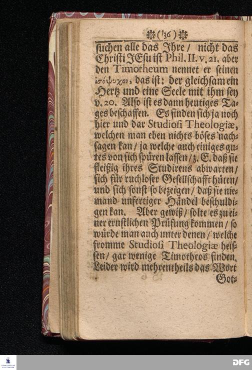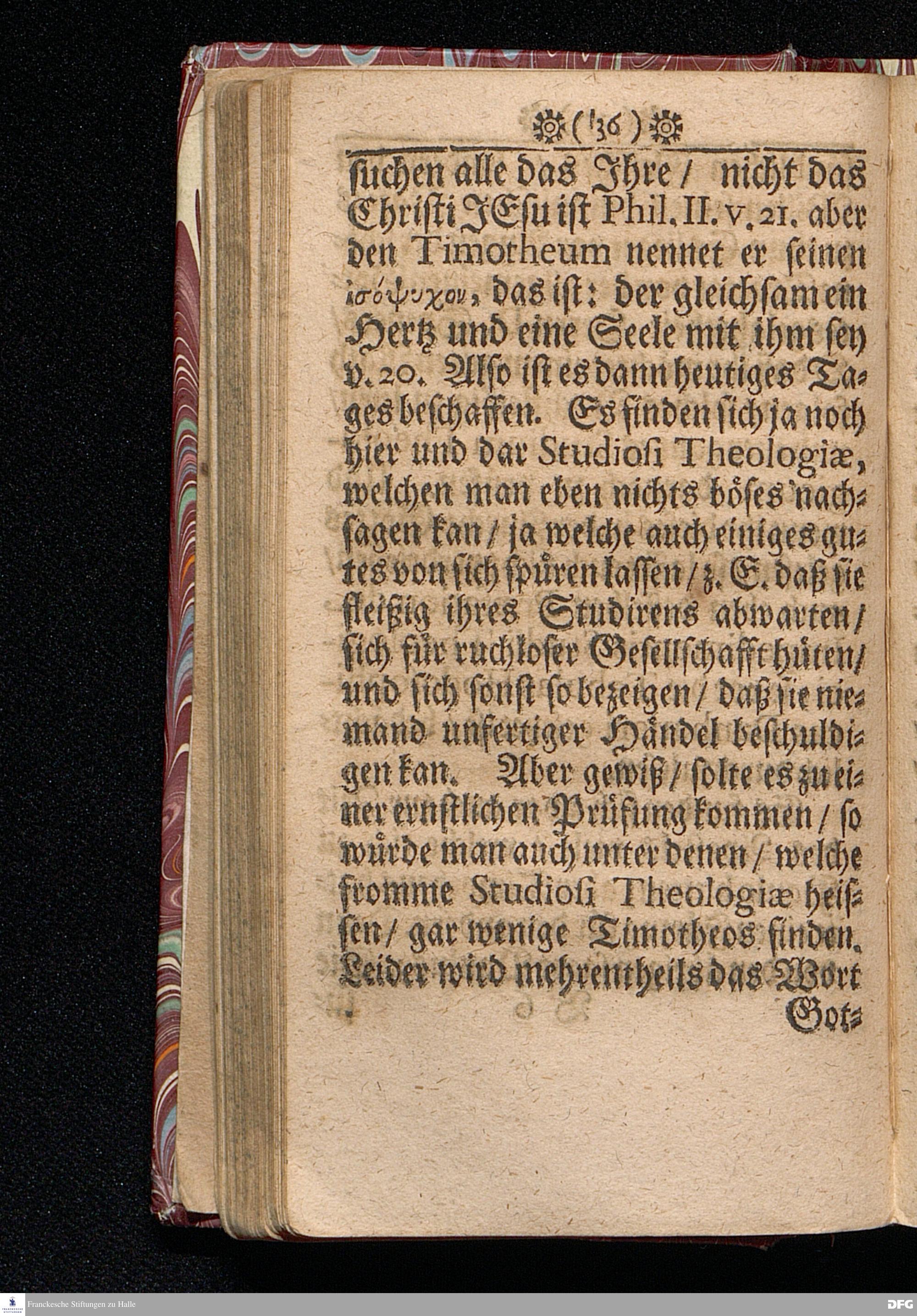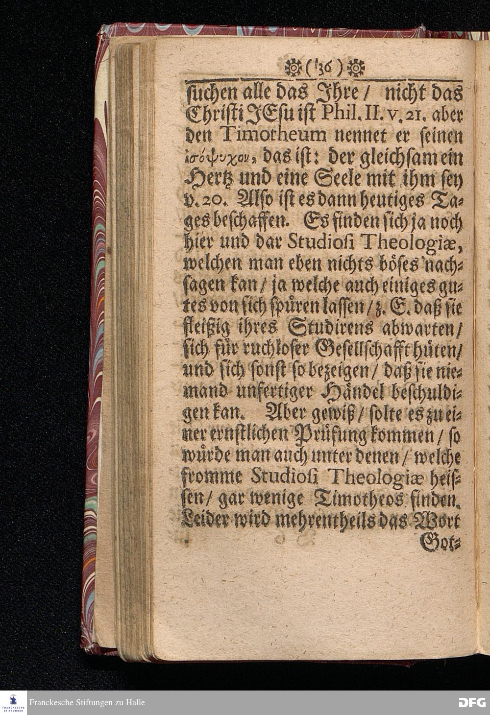 Timotheus Zum Fürbilde Allen Theologiæ Studiosis dargestellet von M.Aug.Hermann Francken / Gr.& Or.Lingg.P.P.& P.Glauch. Editio secunda & auctior. [Bibelzitat.] Halle / verlegts Joh.Friedrich Zeitler. 1695.