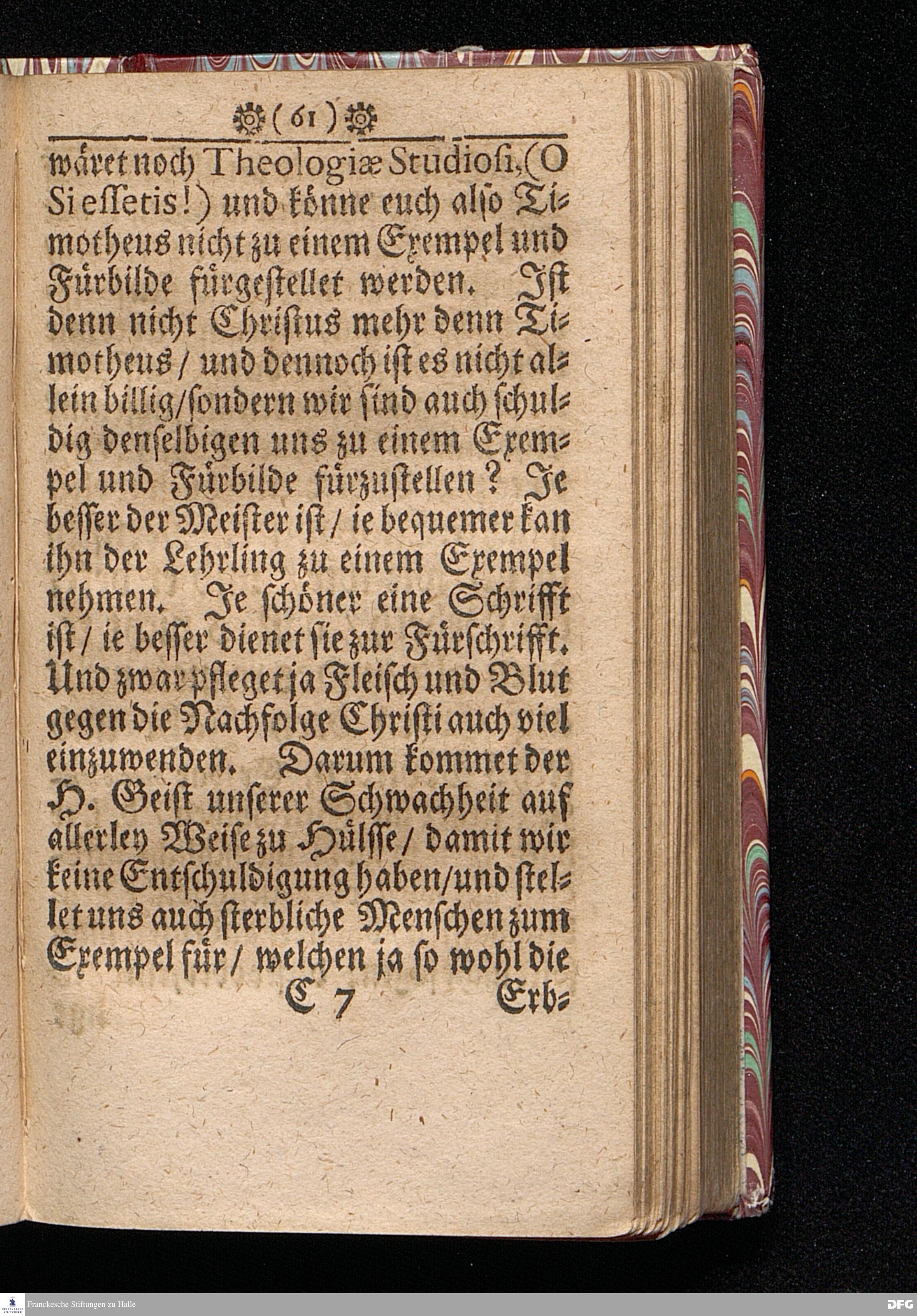 Timotheus Zum Fürbilde Allen Theologiæ Studiosis dargestellet von M.Aug.Hermann Francken / Gr.& Or.Lingg.P.P.& P.Glauch. Editio secunda & auctior. [Bibelzitat.] Halle / verlegts Joh.Friedrich Zeitler. 1695.