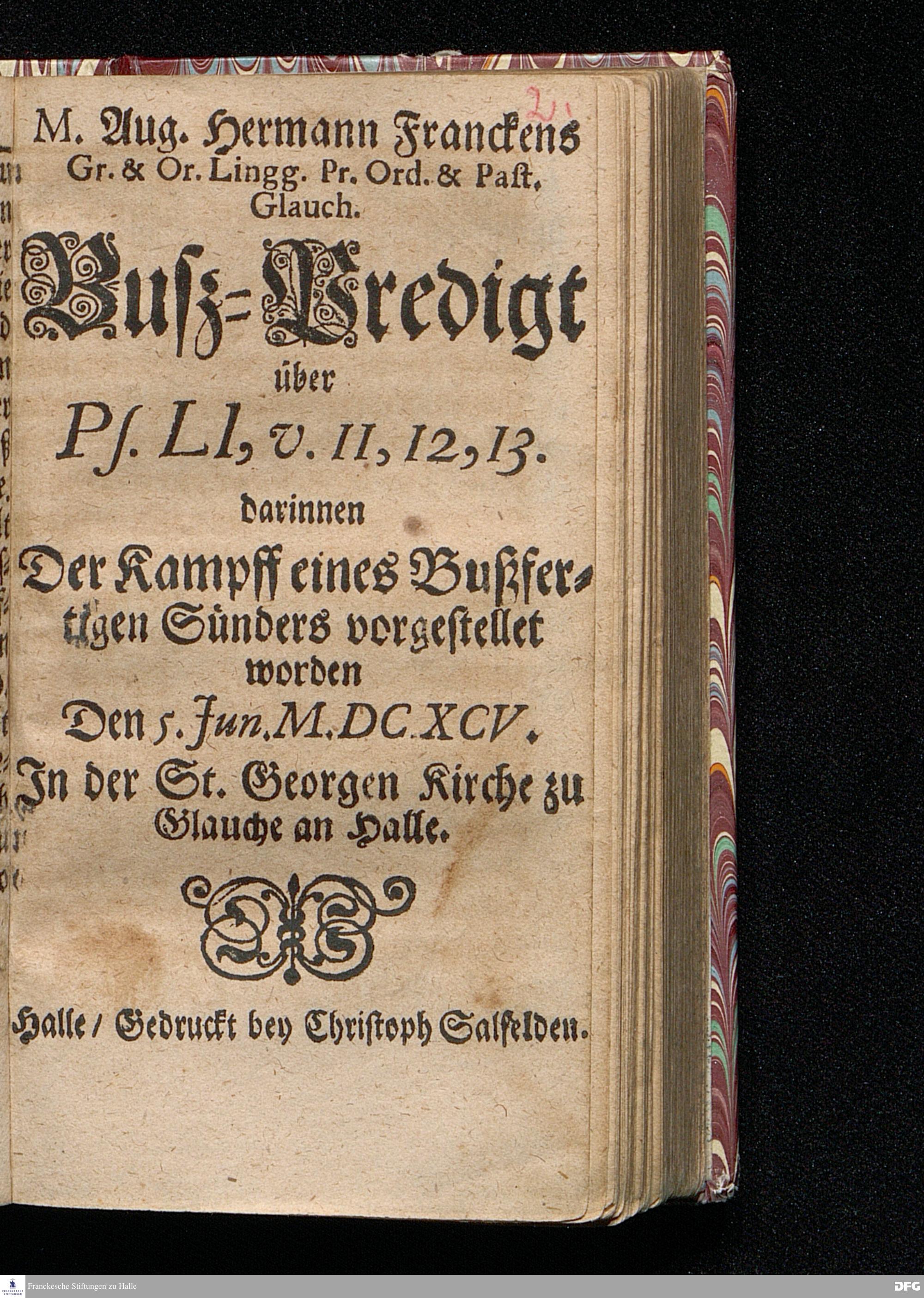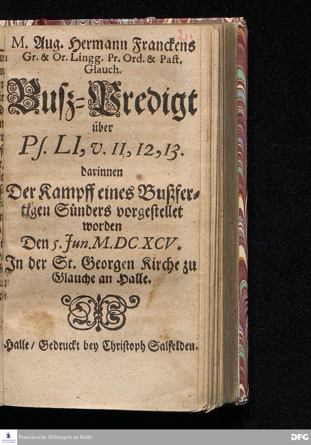 M.Aug.Hermann Franckens Gr.& Or.Lingg.Pr.Ord.& Past.Glauch. Busz=Predigt über Ps.LI, v.11,12,13. darinnen Der Kampff eines Bußfertigen Sünders vorgestellet worden Den 5.Jun. M.DC.XCV. In der St.Georgen Kirche zu Glauche an Halle. Halle / Gedruckt bey Christoph Salfelden.