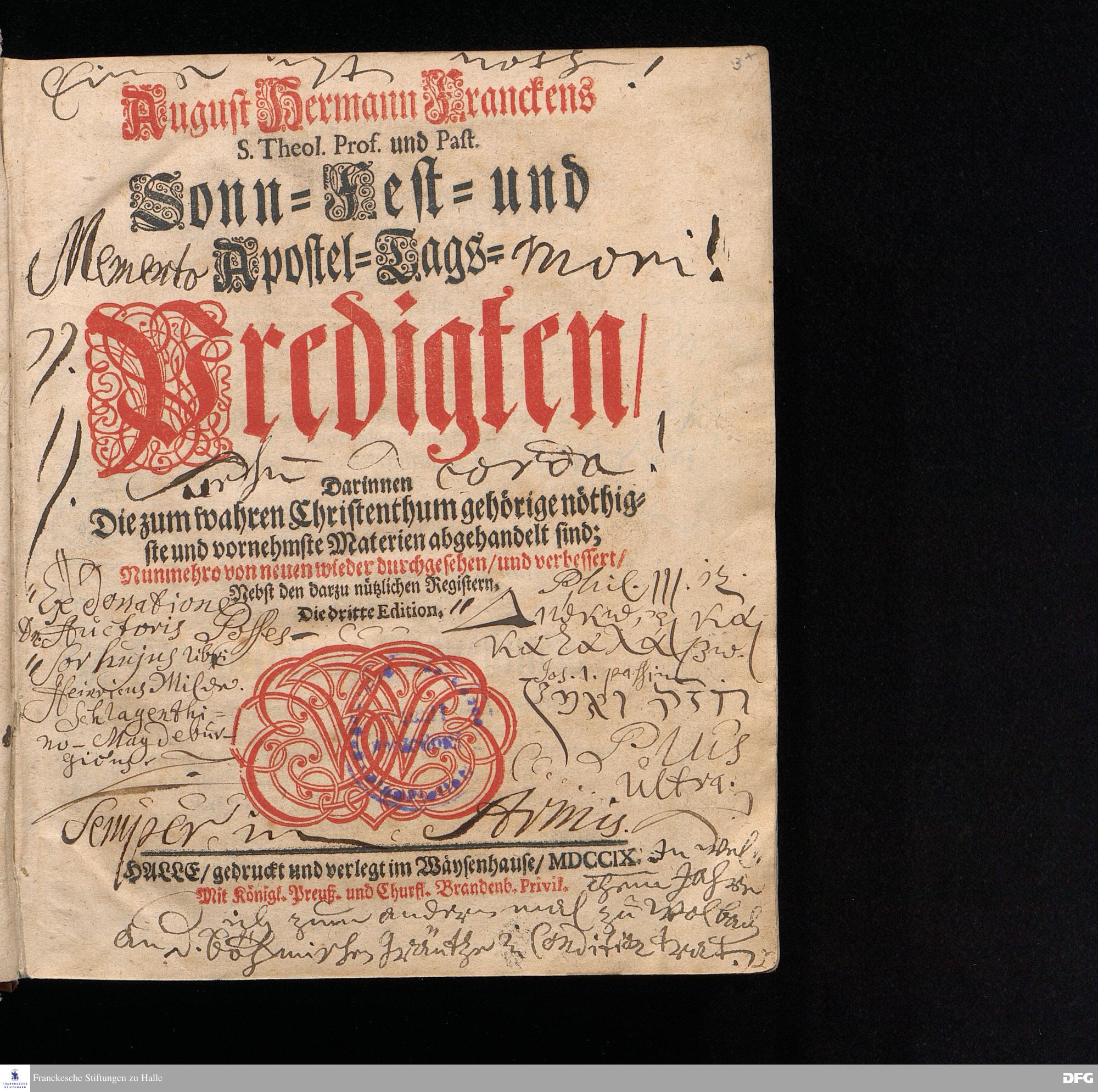 August Hermann Franckens S.Theol.Prof.und Past. Sonn= Fest= und Apostel=Tags=Predigten / Darinnen Die zum wahren Christenthum gehörige nöthigste und vornehmste Materien abgehandelt sind; Nunmehro von neuen wieder durchgesehen / und verbessert / Nebst den darzu nützlichen Registern. Die dritte Edition. HALLE / gedruckt und verlegt im Wäysenhause / MDCCIX. Mit Königl.Preuß.und Churfl.Brandenb.Privil.