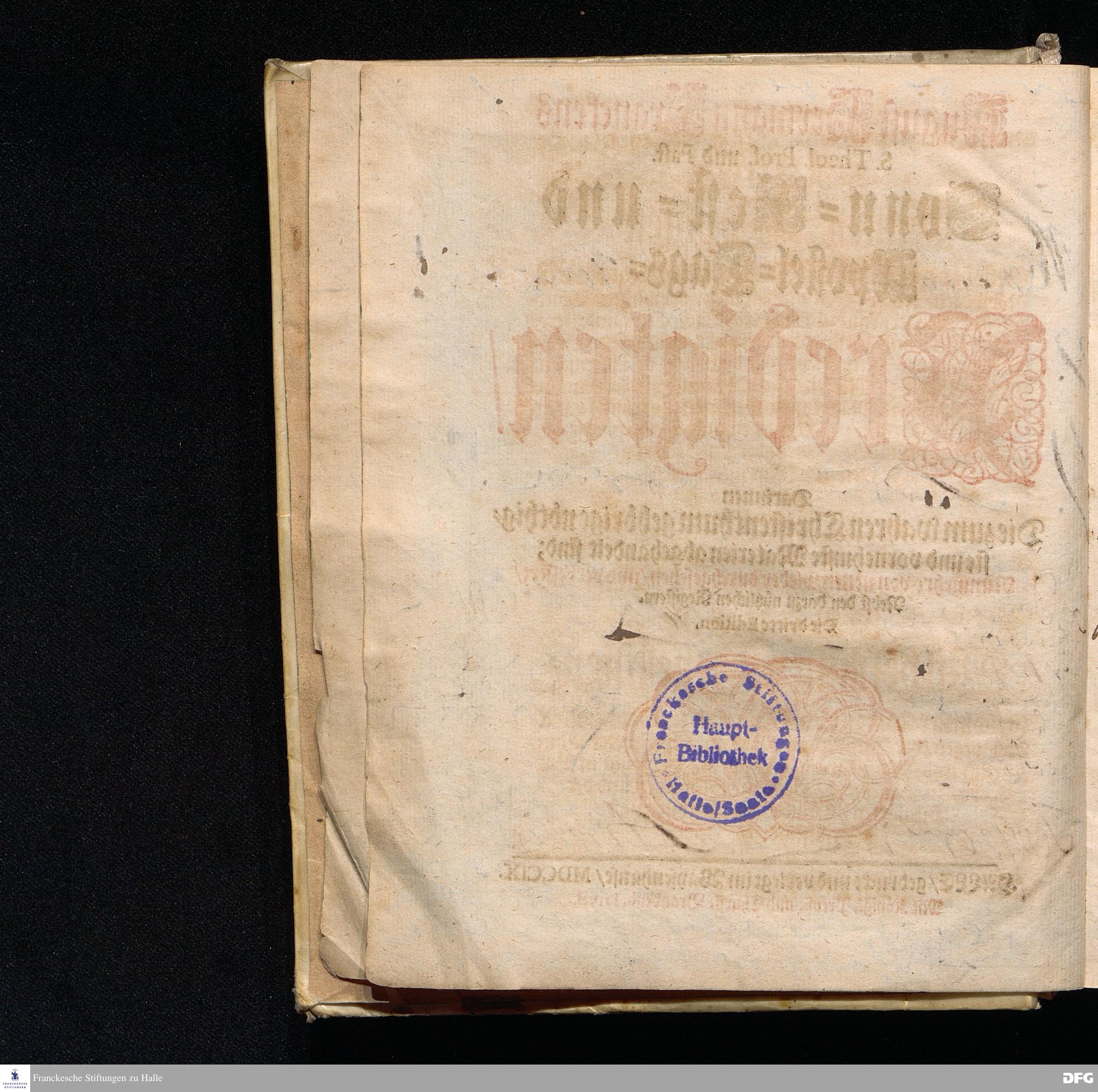 August Hermann Franckens S.Theol.Prof.und Past. Sonn= Fest= und Apostel=Tags=Predigten / Darinnen Die zum wahren Christenthum gehörige nöthigste und vornehmste Materien abgehandelt sind; Nunmehro von neuen wieder durchgesehen / und verbessert / Nebst den darzu nützlichen Registern. Die dritte Edition. HALLE / gedruckt und verlegt im Wäysenhause / MDCCIX. Mit Königl.Preuß.und Churfl.Brandenb.Privil.