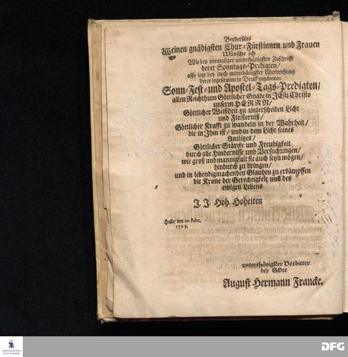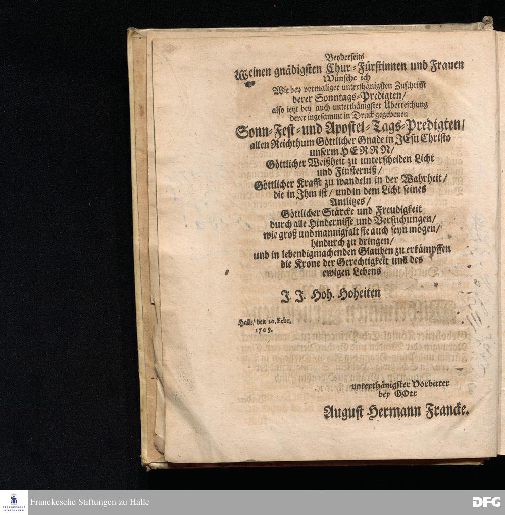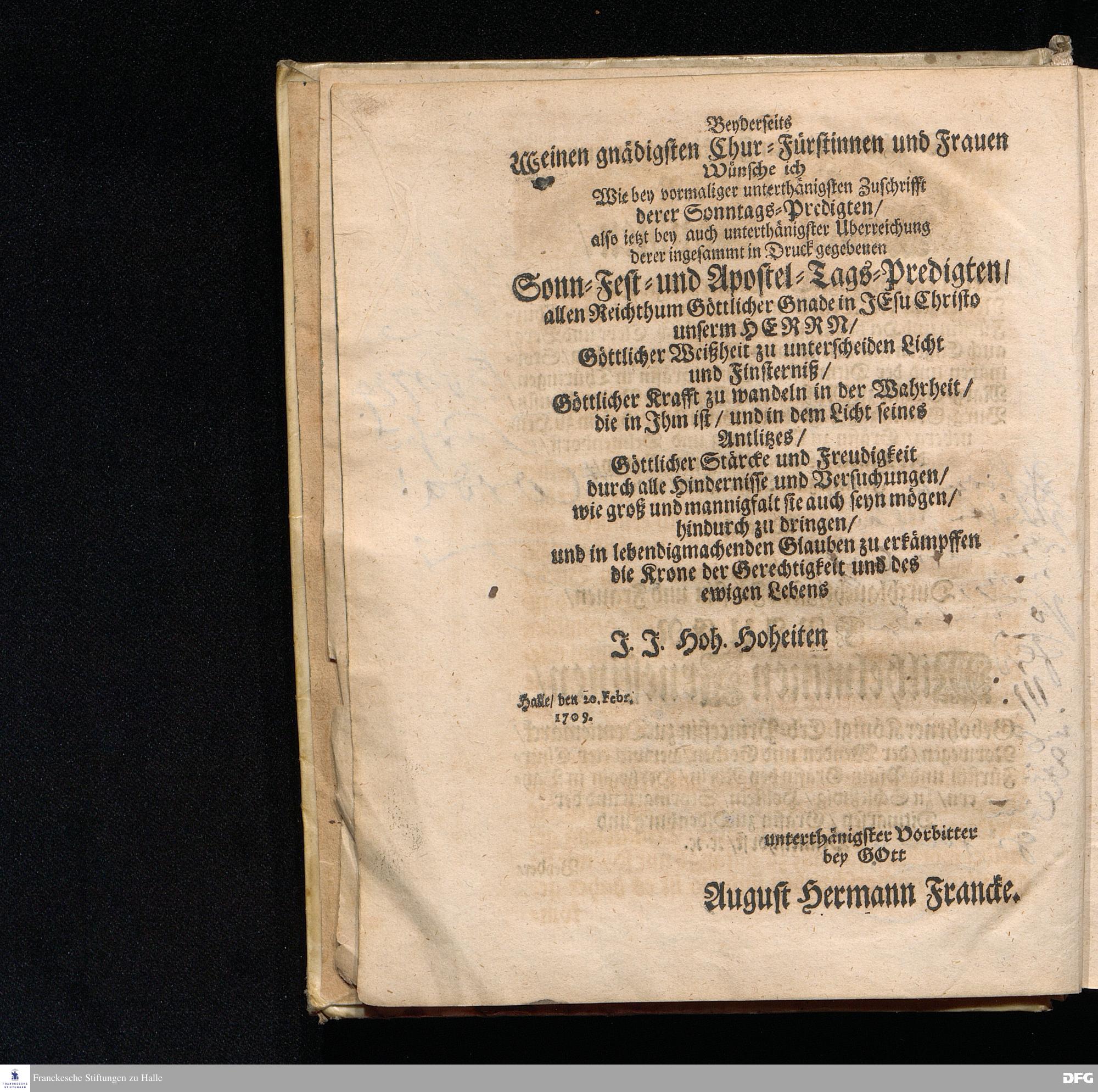 August Hermann Franckens S.Theol.Prof.und Past. Sonn= Fest= und Apostel=Tags=Predigten / Darinnen Die zum wahren Christenthum gehörige nöthigste und vornehmste Materien abgehandelt sind; Nunmehro von neuen wieder durchgesehen / und verbessert / Nebst den darzu nützlichen Registern. Die dritte Edition. HALLE / gedruckt und verlegt im Wäysenhause / MDCCIX. Mit Königl.Preuß.und Churfl.Brandenb.Privil.