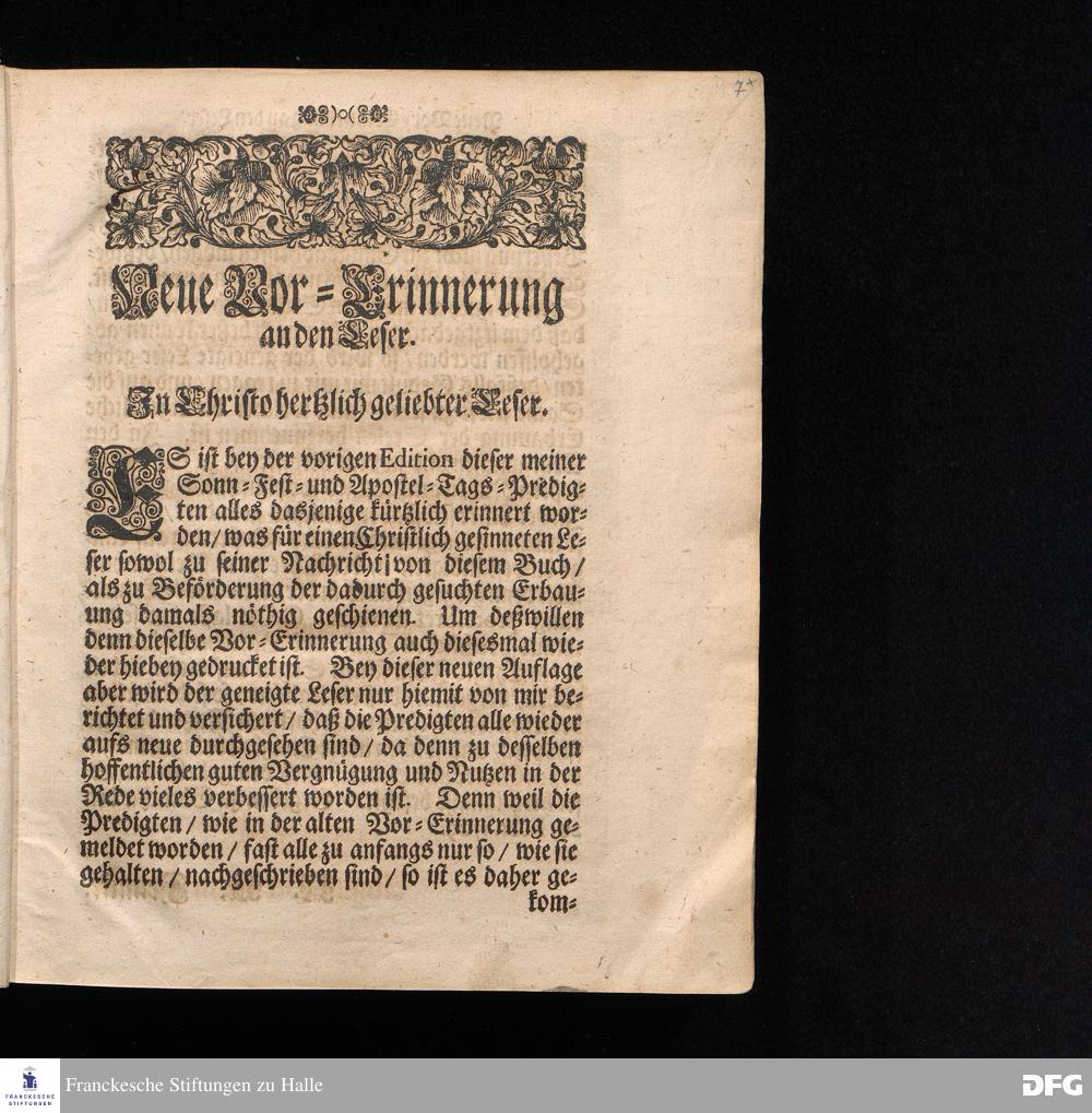 August Hermann Franckens S.Theol.Prof.und Past. Sonn= Fest= und Apostel=Tags=Predigten / Darinnen Die zum wahren Christenthum gehörige nöthigste und vornehmste Materien abgehandelt sind; Nunmehro von neuen wieder durchgesehen / und verbessert / Nebst den darzu nützlichen Registern. Die dritte Edition. HALLE / gedruckt und verlegt im Wäysenhause / MDCCIX. Mit Königl.Preuß.und Churfl.Brandenb.Privil.