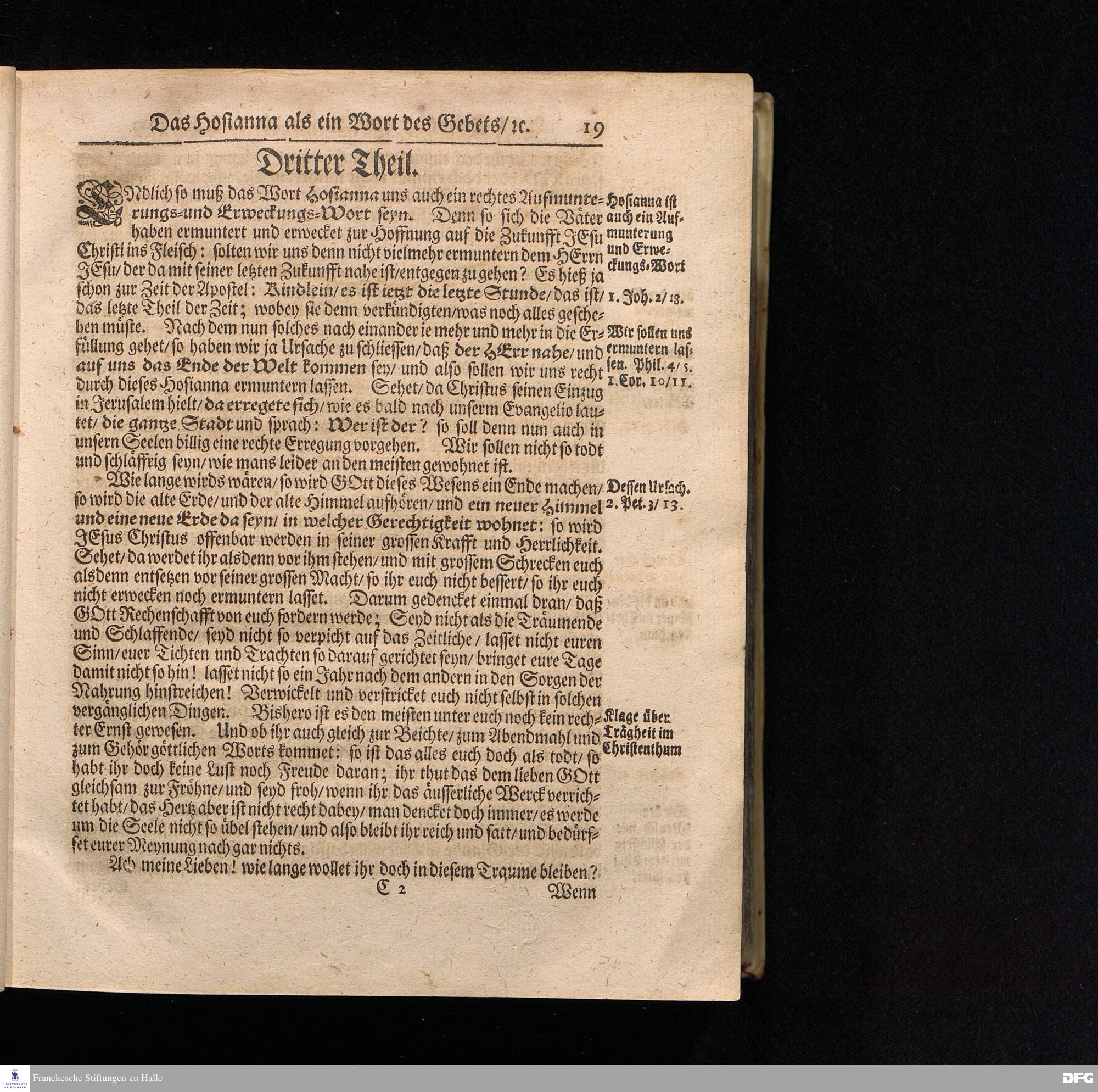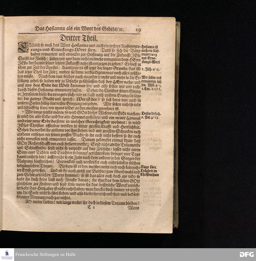 August Hermann Franckens S.Theol.Prof.und Past. Sonn= Fest= und Apostel=Tags=Predigten / Darinnen Die zum wahren Christenthum gehörige nöthigste und vornehmste Materien abgehandelt sind; Nunmehro von neuen wieder durchgesehen / und verbessert / Nebst den darzu nützlichen Registern. Die dritte Edition. HALLE / gedruckt und verlegt im Wäysenhause / MDCCIX. Mit Königl.Preuß.und Churfl.Brandenb.Privil.