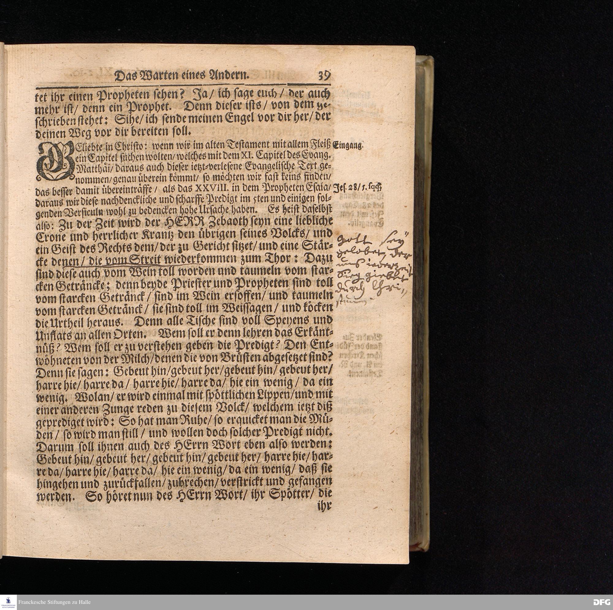 August Hermann Franckens S.Theol.Prof.und Past. Sonn= Fest= und Apostel=Tags=Predigten / Darinnen Die zum wahren Christenthum gehörige nöthigste und vornehmste Materien abgehandelt sind; Nunmehro von neuen wieder durchgesehen / und verbessert / Nebst den darzu nützlichen Registern. Die dritte Edition. HALLE / gedruckt und verlegt im Wäysenhause / MDCCIX. Mit Königl.Preuß.und Churfl.Brandenb.Privil.