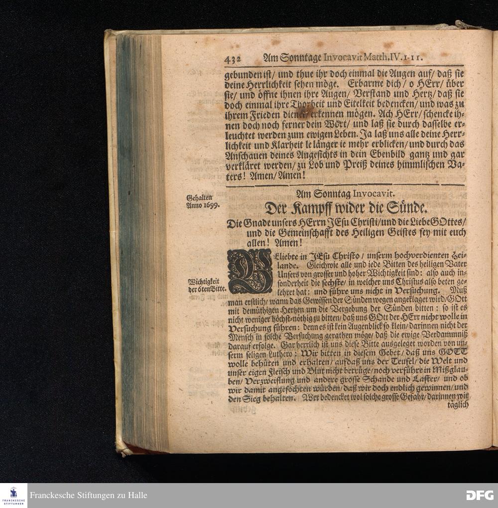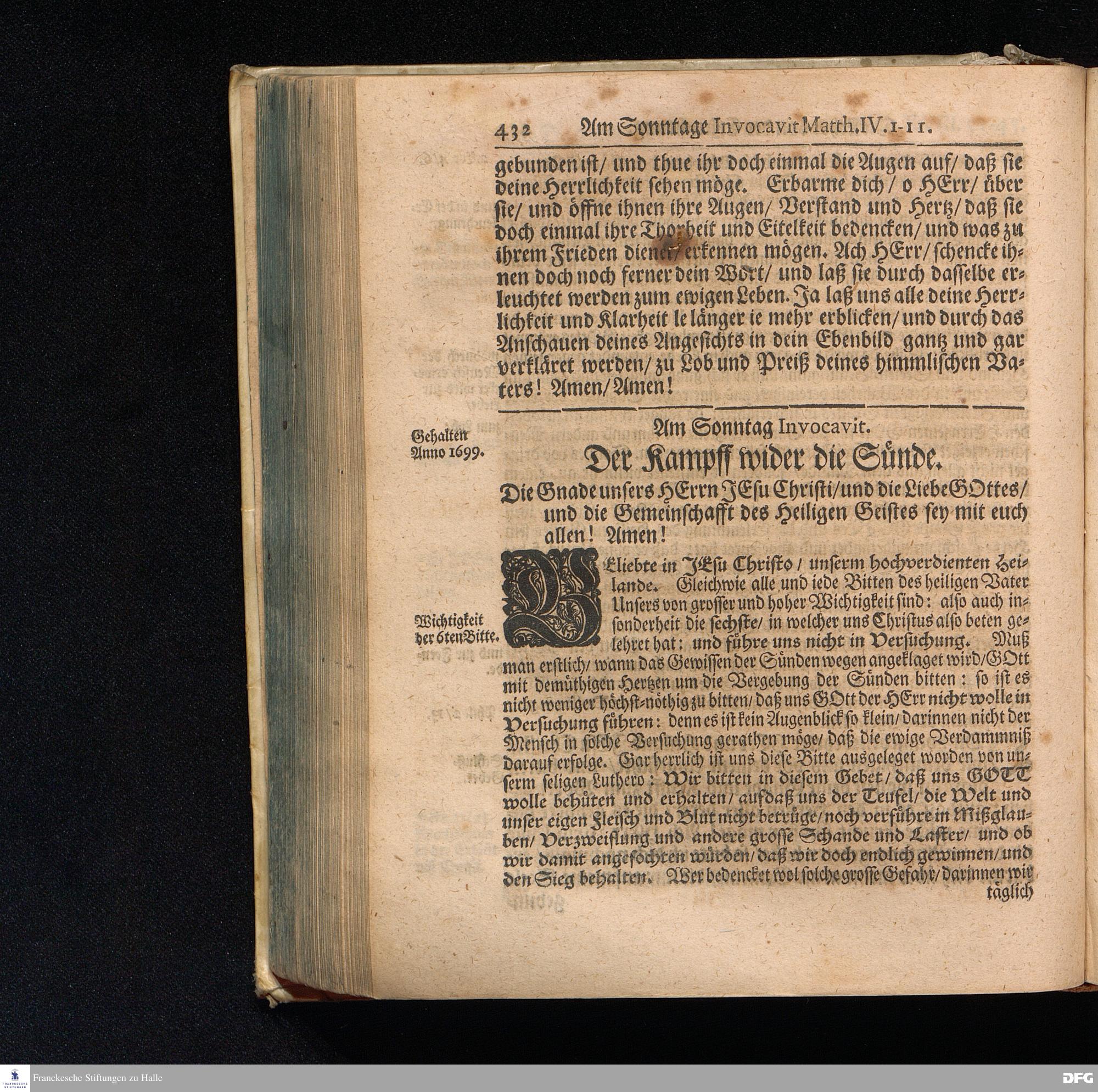 August Hermann Franckens S.Theol.Prof.und Past. Sonn= Fest= und Apostel=Tags=Predigten / Darinnen Die zum wahren Christenthum gehörige nöthigste und vornehmste Materien abgehandelt sind; Nunmehro von neuen wieder durchgesehen / und verbessert / Nebst den darzu nützlichen Registern. Die dritte Edition. HALLE / gedruckt und verlegt im Wäysenhause / MDCCIX. Mit Königl.Preuß.und Churfl.Brandenb.Privil.