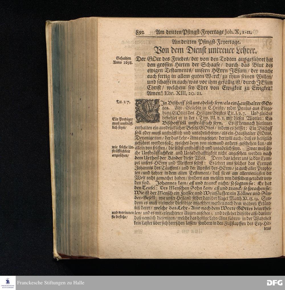 August Hermann Franckens S.Theol.Prof.und Past. Sonn= Fest= und Apostel=Tags=Predigten / Darinnen Die zum wahren Christenthum gehörige nöthigste und vornehmste Materien abgehandelt sind; Nunmehro von neuen wieder durchgesehen / und verbessert / Nebst den darzu nützlichen Registern. Die dritte Edition. HALLE / gedruckt und verlegt im Wäysenhause / MDCCIX. Mit Königl.Preuß.und Churfl.Brandenb.Privil.