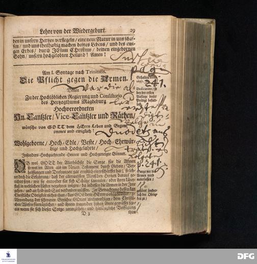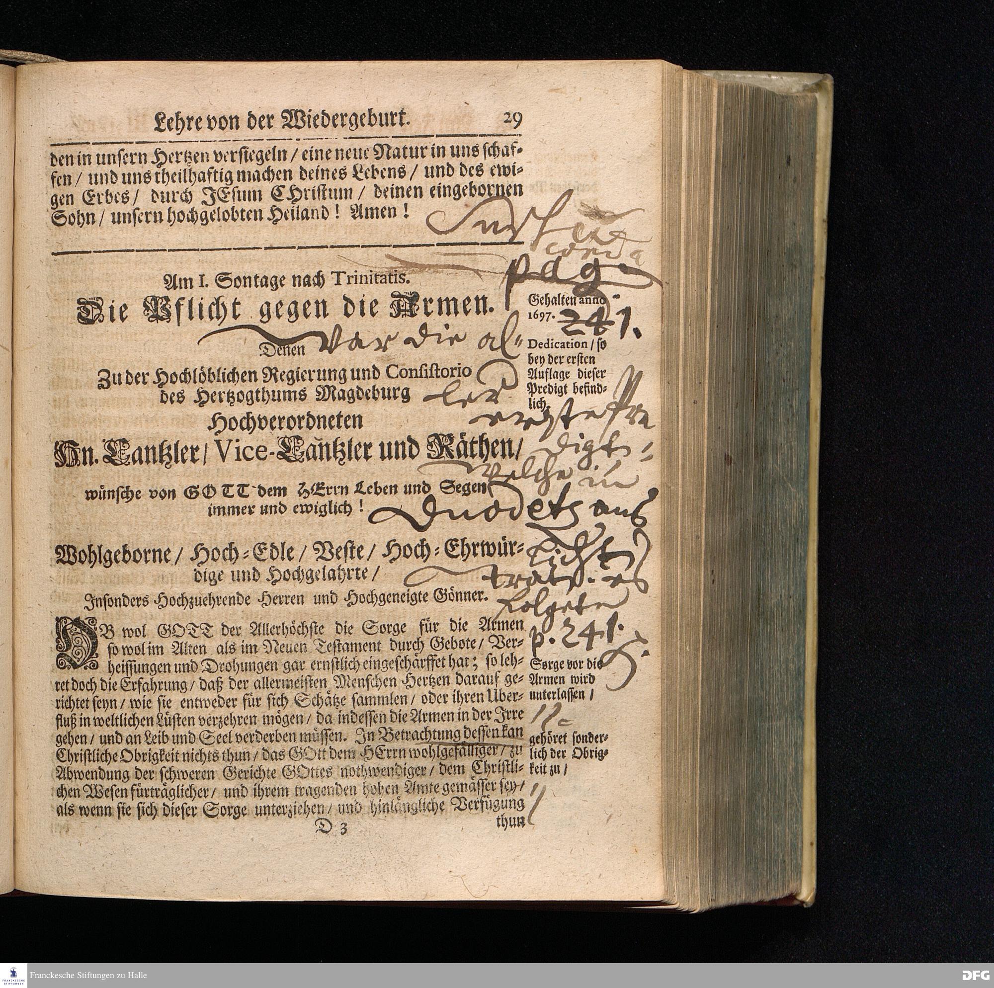 August Hermann Franckens S.Theol.Prof.und Past. Sonn= Fest= und Apostel=Tags=Predigten / Darinnen Die zum wahren Christenthum gehörige nöthigste und vornehmste Materien abgehandelt sind; Nunmehro von neuen wieder durchgesehen / und verbessert / Nebst den darzu nützlichen Registern. Die dritte Edition. HALLE / gedruckt und verlegt im Wäysenhause / MDCCIX. Mit Königl.Preuß.und Churfl.Brandenb.Privil.