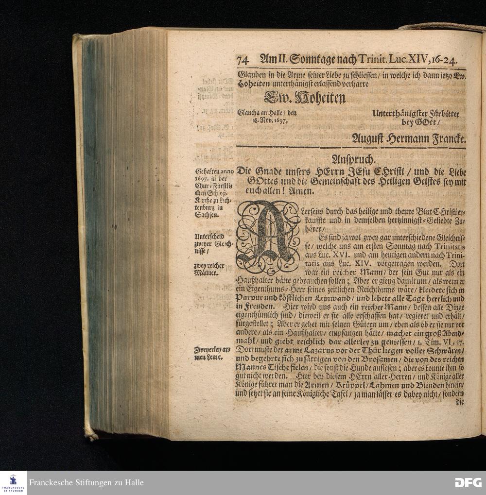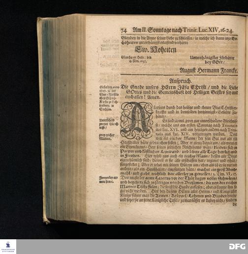 August Hermann Franckens S.Theol.Prof.und Past. Sonn= Fest= und Apostel=Tags=Predigten / Darinnen Die zum wahren Christenthum gehörige nöthigste und vornehmste Materien abgehandelt sind; Nunmehro von neuen wieder durchgesehen / und verbessert / Nebst den darzu nützlichen Registern. Die dritte Edition. HALLE / gedruckt und verlegt im Wäysenhause / MDCCIX. Mit Königl.Preuß.und Churfl.Brandenb.Privil.