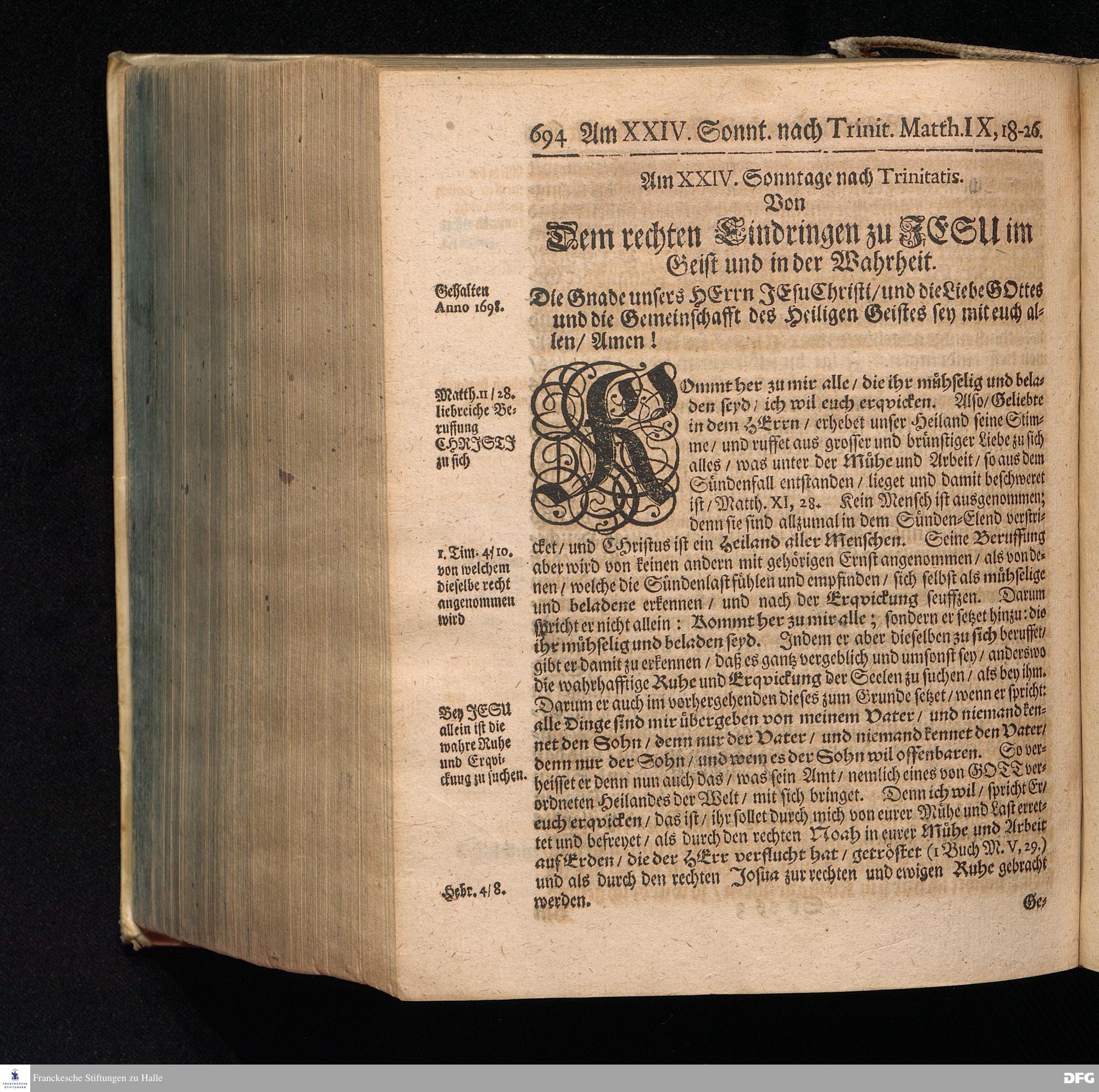 August Hermann Franckens S.Theol.Prof.und Past. Sonn= Fest= und Apostel=Tags=Predigten / Darinnen Die zum wahren Christenthum gehörige nöthigste und vornehmste Materien abgehandelt sind; Nunmehro von neuen wieder durchgesehen / und verbessert / Nebst den darzu nützlichen Registern. Die dritte Edition. HALLE / gedruckt und verlegt im Wäysenhause / MDCCIX. Mit Königl.Preuß.und Churfl.Brandenb.Privil.