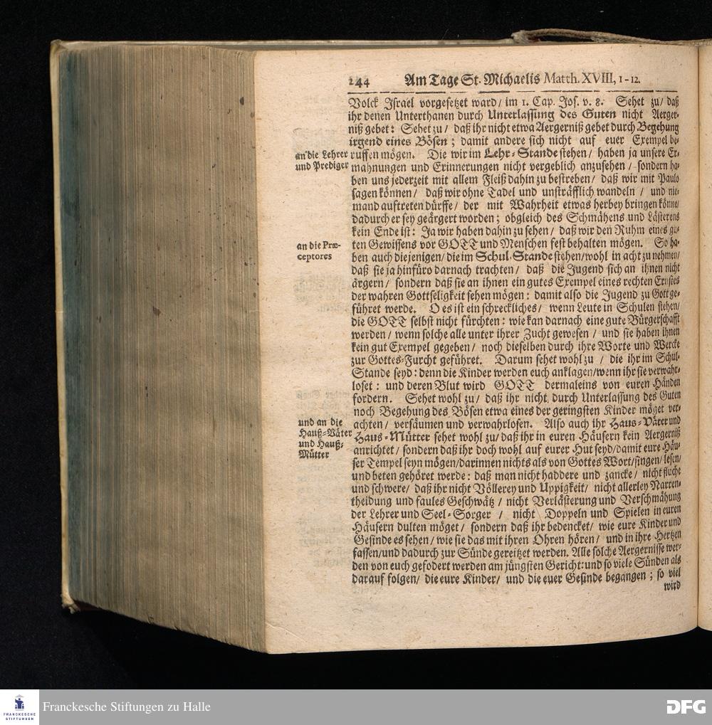 August Hermann Franckens S.Theol.Prof.und Past. Sonn= Fest= und Apostel=Tags=Predigten / Darinnen Die zum wahren Christenthum gehörige nöthigste und vornehmste Materien abgehandelt sind; Nunmehro von neuen wieder durchgesehen / und verbessert / Nebst den darzu nützlichen Registern. Die dritte Edition. HALLE / gedruckt und verlegt im Wäysenhause / MDCCIX. Mit Königl.Preuß.und Churfl.Brandenb.Privil.