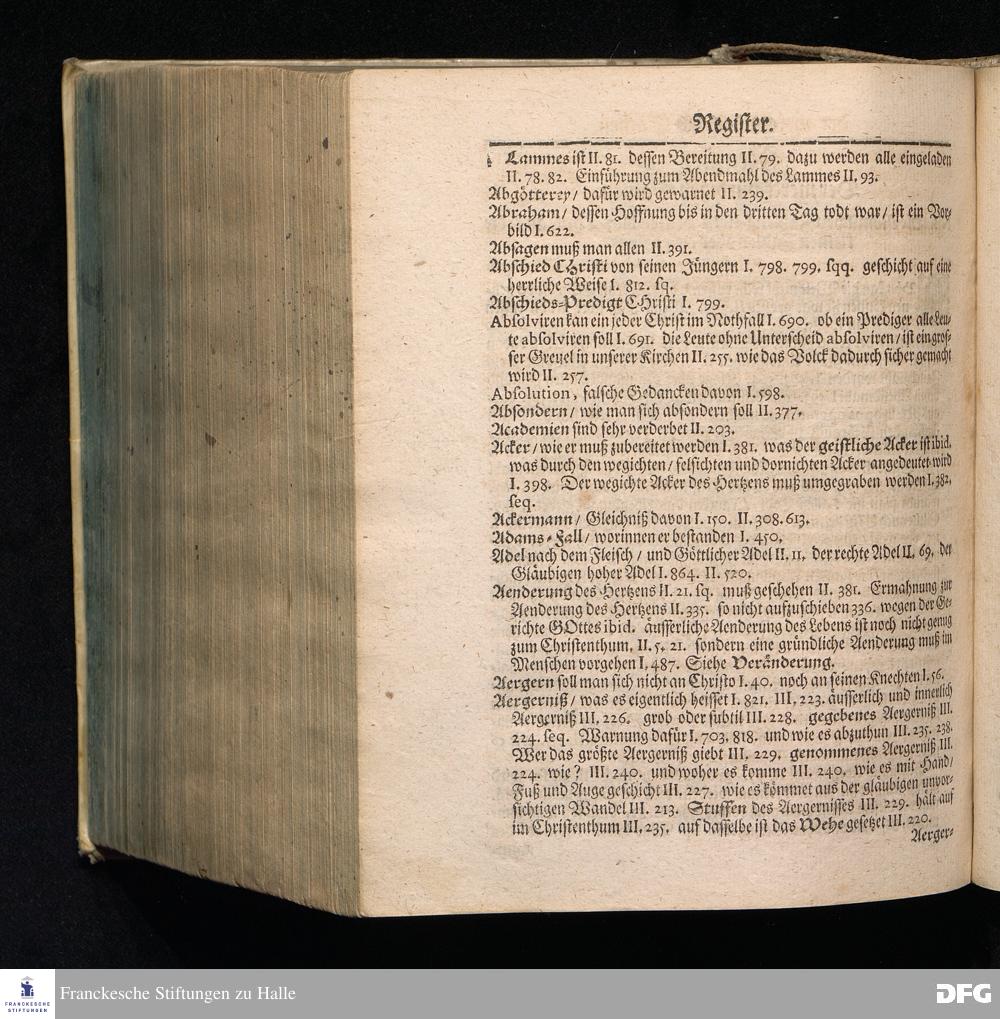 August Hermann Franckens S.Theol.Prof.und Past. Sonn= Fest= und Apostel=Tags=Predigten / Darinnen Die zum wahren Christenthum gehörige nöthigste und vornehmste Materien abgehandelt sind; Nunmehro von neuen wieder durchgesehen / und verbessert / Nebst den darzu nützlichen Registern. Die dritte Edition. HALLE / gedruckt und verlegt im Wäysenhause / MDCCIX. Mit Königl.Preuß.und Churfl.Brandenb.Privil.