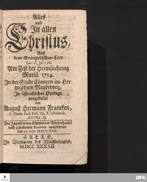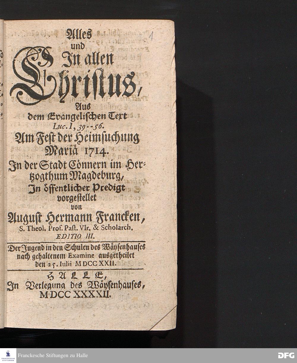 Alles und In allen Christus, Aus dem Evangelischen Text Luc.I, 39--56. Am Fest der Heimsuchung Mariä 1714. In der Stadt Cönnern im Hertzogthum Magdeburg, In öffentlicher Predigt vorgestellet von August Hermann Francken, S.Theol.Prof.Past.Vlr.& Scholarch. EDITIO III. Der Jugend in den Schulen des Wäysenhauses nach gehaltenem Examine ausgetheilet den 25.Iulii MDCCXXII. HALLE, In Verlegung des Wäysenhauses, MDCCXXXXII.