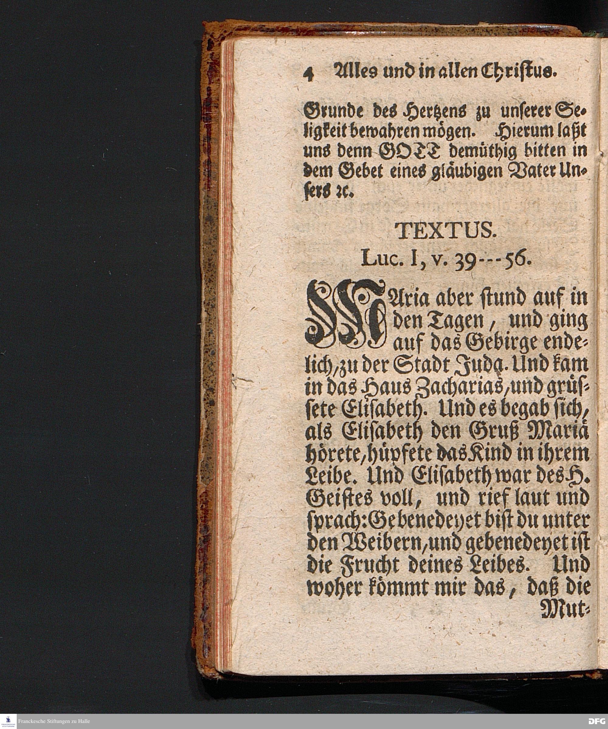 Alles und In allen Christus, Aus dem Evangelischen Text Luc.I, 39--56. Am Fest der Heimsuchung Mariä 1714. In der Stadt Cönnern im Hertzogthum Magdeburg, In öffentlicher Predigt vorgestellet von August Hermann Francken, S.Theol.Prof.Past.Vlr.& Scholarch. EDITIO III. Der Jugend in den Schulen des Wäysenhauses nach gehaltenem Examine ausgetheilet den 25.Iulii MDCCXXII. HALLE, In Verlegung des Wäysenhauses, MDCCXXXXII.