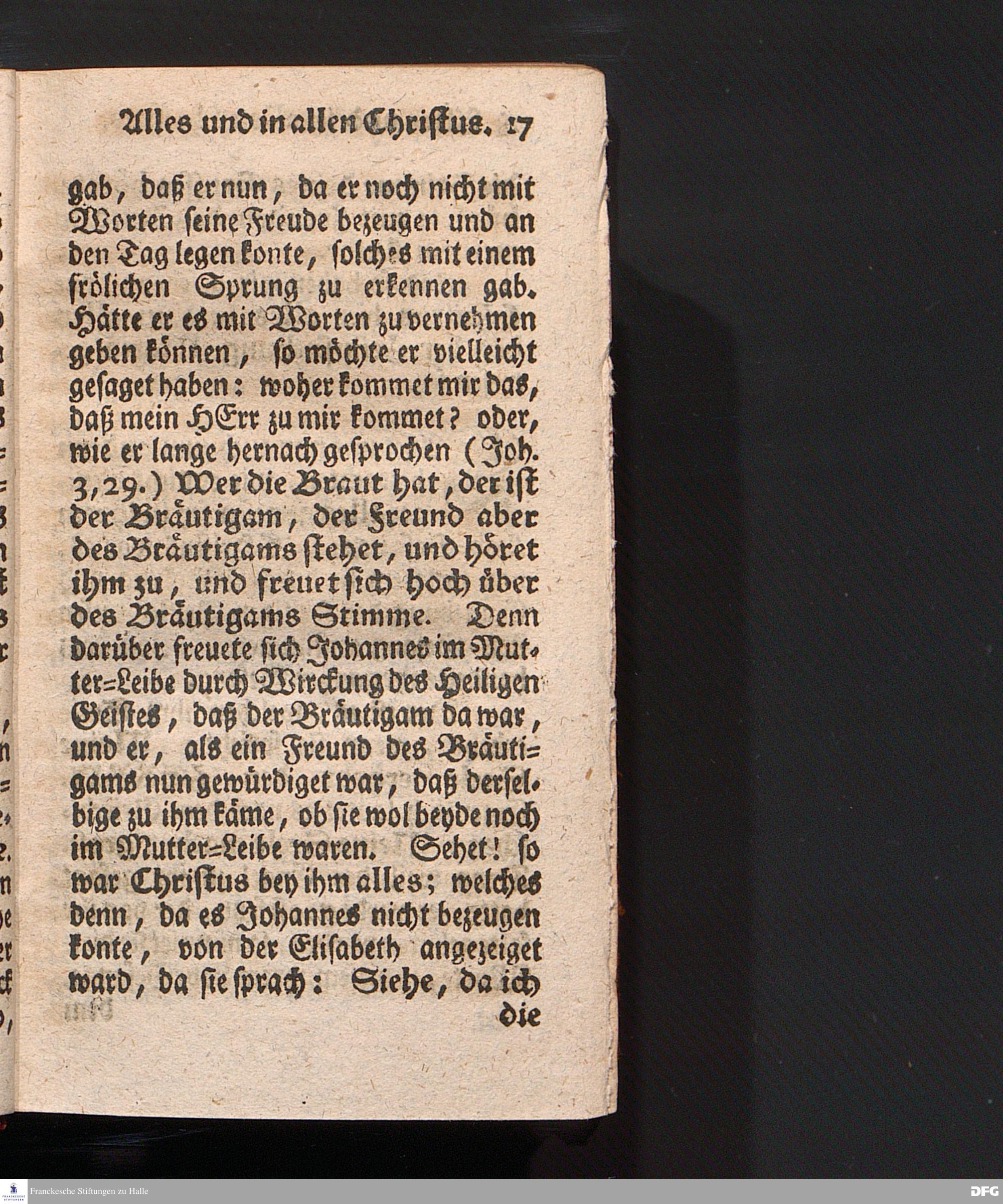 Alles und In allen Christus, Aus dem Evangelischen Text Luc.I, 39--56. Am Fest der Heimsuchung Mariä 1714. In der Stadt Cönnern im Hertzogthum Magdeburg, In öffentlicher Predigt vorgestellet von August Hermann Francken, S.Theol.Prof.Past.Vlr.& Scholarch. EDITIO III. Der Jugend in den Schulen des Wäysenhauses nach gehaltenem Examine ausgetheilet den 25.Iulii MDCCXXII. HALLE, In Verlegung des Wäysenhauses, MDCCXXXXII.