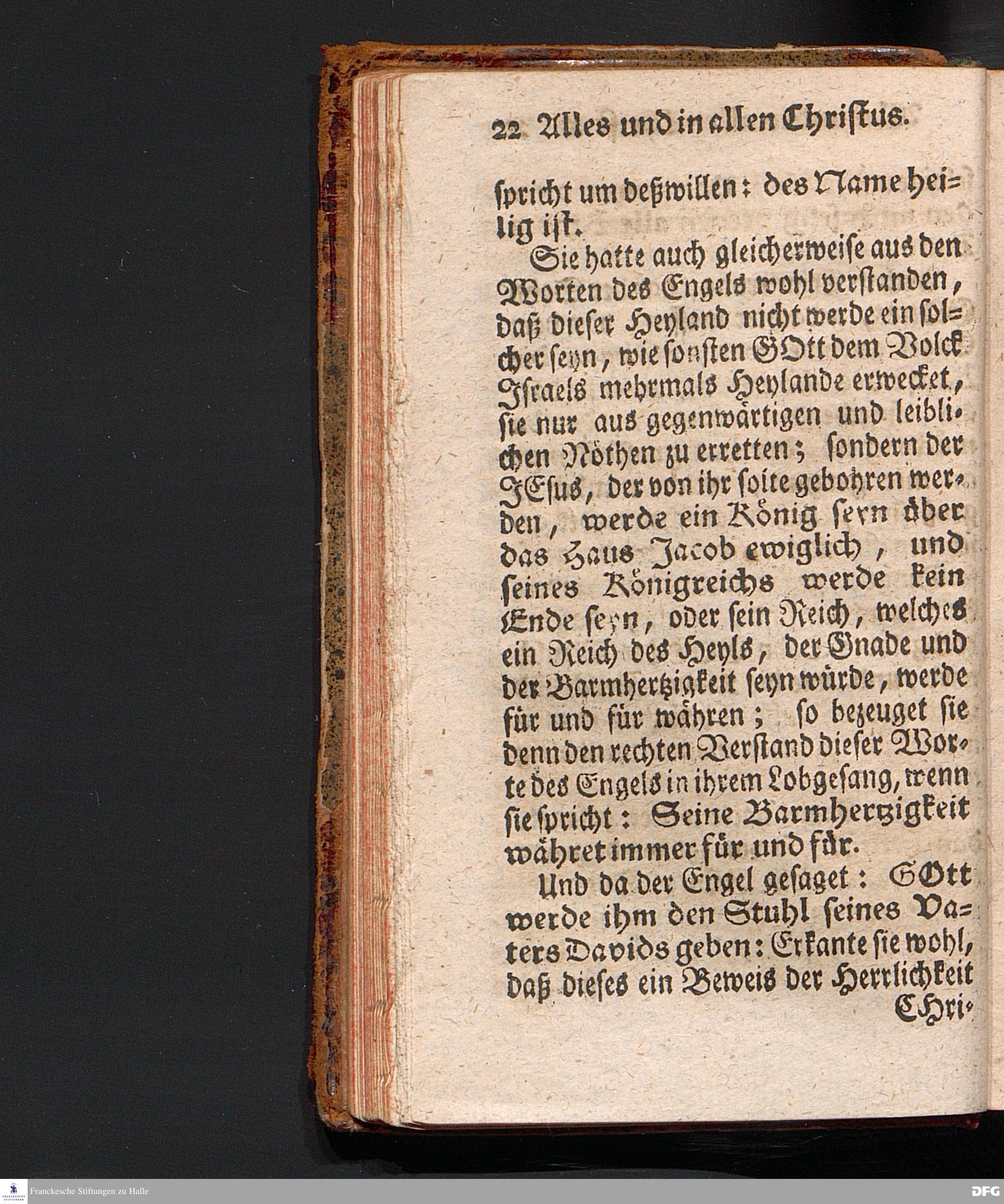 Alles und In allen Christus, Aus dem Evangelischen Text Luc.I, 39--56. Am Fest der Heimsuchung Mariä 1714. In der Stadt Cönnern im Hertzogthum Magdeburg, In öffentlicher Predigt vorgestellet von August Hermann Francken, S.Theol.Prof.Past.Vlr.& Scholarch. EDITIO III. Der Jugend in den Schulen des Wäysenhauses nach gehaltenem Examine ausgetheilet den 25.Iulii MDCCXXII. HALLE, In Verlegung des Wäysenhauses, MDCCXXXXII.