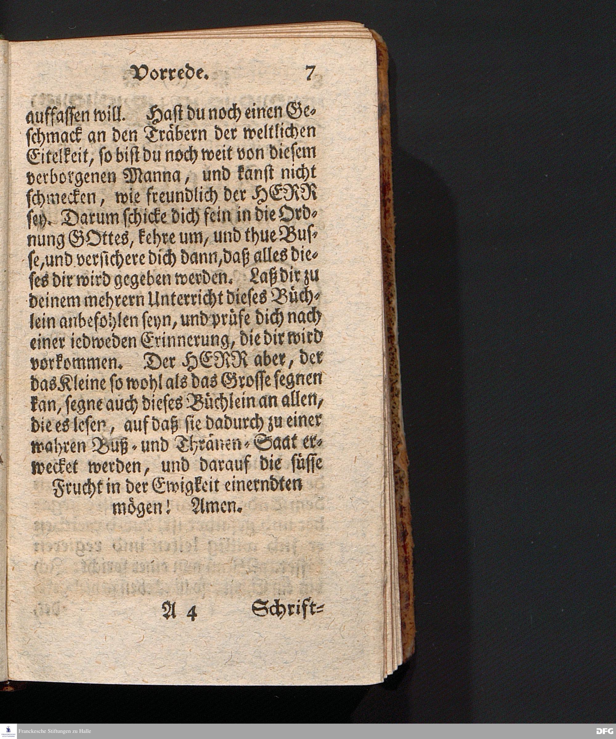 Die Lehre Vom Anfang Christliches Lebens, Bestehend in vier Theilen: I. In einer gründlichen Anleitung zu wahrer Busse und Glauben an GOTT. II. In einem einfältigen Unterricht, wie man die H.Schrift zu seiner wahren Erbauung lesen solle. III. In einer Schriftmäßigen Anweisung, recht und GOTT gefällig zu beten. IV. In einer kurtzen Prüfung, ob man den wahren lebendigen Glauben an CHristum habe oder nicht. Die XVI.Auflage. HALLE, In Verlegung des Wäysenhauses, 1740.