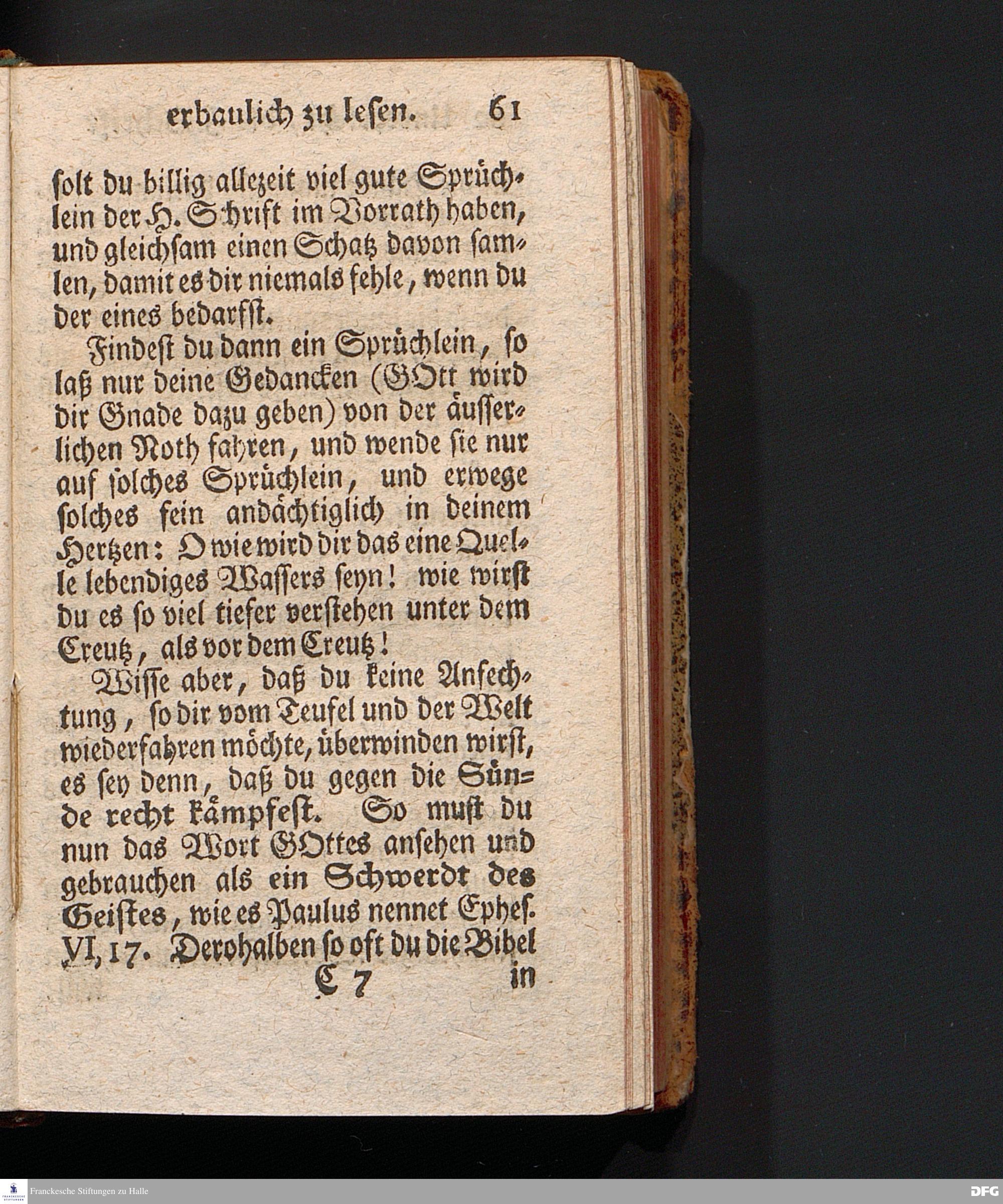 Die Lehre Vom Anfang Christliches Lebens, Bestehend in vier Theilen: I. In einer gründlichen Anleitung zu wahrer Busse und Glauben an GOTT. II. In einem einfältigen Unterricht, wie man die H.Schrift zu seiner wahren Erbauung lesen solle. III. In einer Schriftmäßigen Anweisung, recht und GOTT gefällig zu beten. IV. In einer kurtzen Prüfung, ob man den wahren lebendigen Glauben an CHristum habe oder nicht. Die XVI.Auflage. HALLE, In Verlegung des Wäysenhauses, 1740.