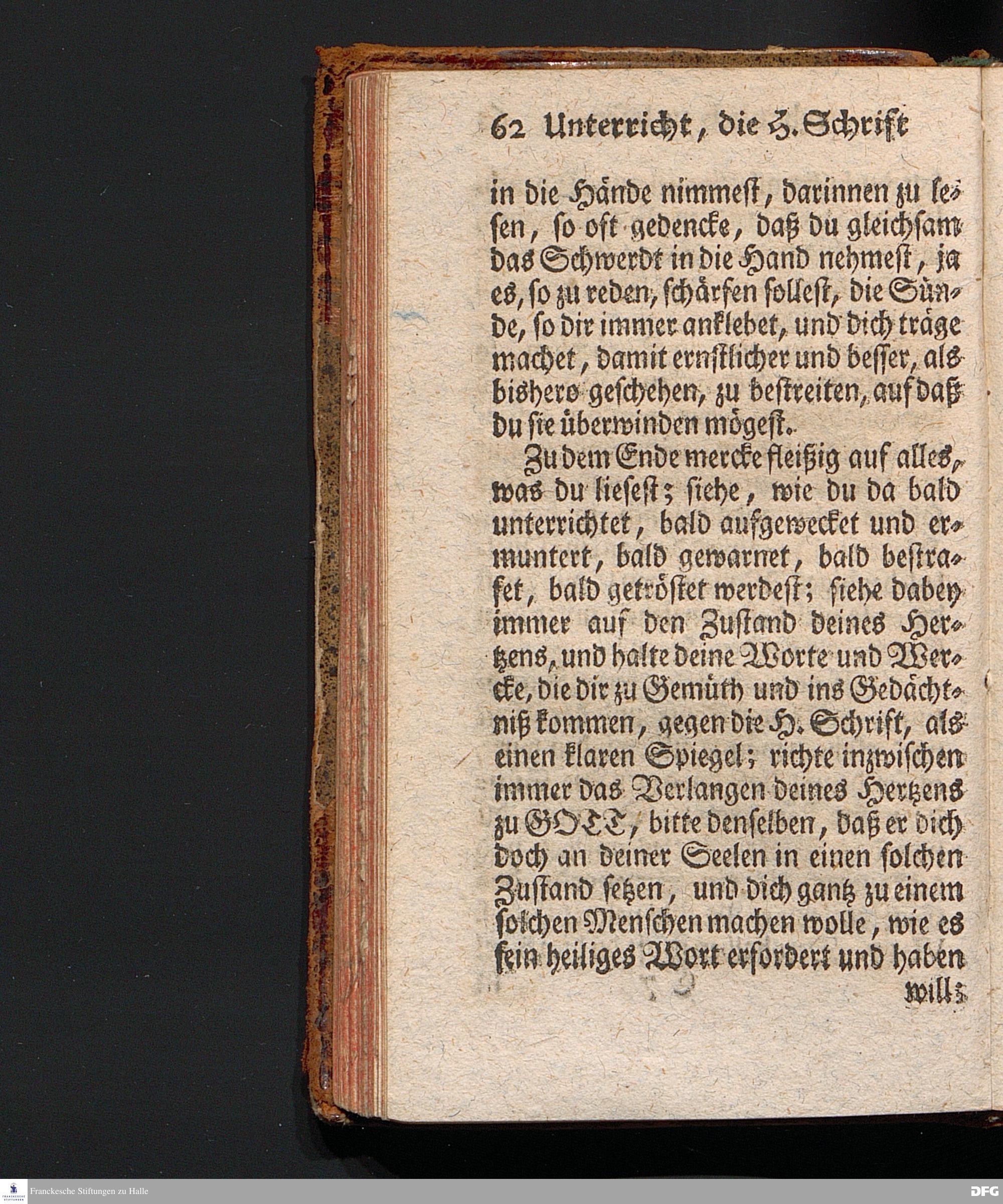 Die Lehre Vom Anfang Christliches Lebens, Bestehend in vier Theilen: I. In einer gründlichen Anleitung zu wahrer Busse und Glauben an GOTT. II. In einem einfältigen Unterricht, wie man die H.Schrift zu seiner wahren Erbauung lesen solle. III. In einer Schriftmäßigen Anweisung, recht und GOTT gefällig zu beten. IV. In einer kurtzen Prüfung, ob man den wahren lebendigen Glauben an CHristum habe oder nicht. Die XVI.Auflage. HALLE, In Verlegung des Wäysenhauses, 1740.