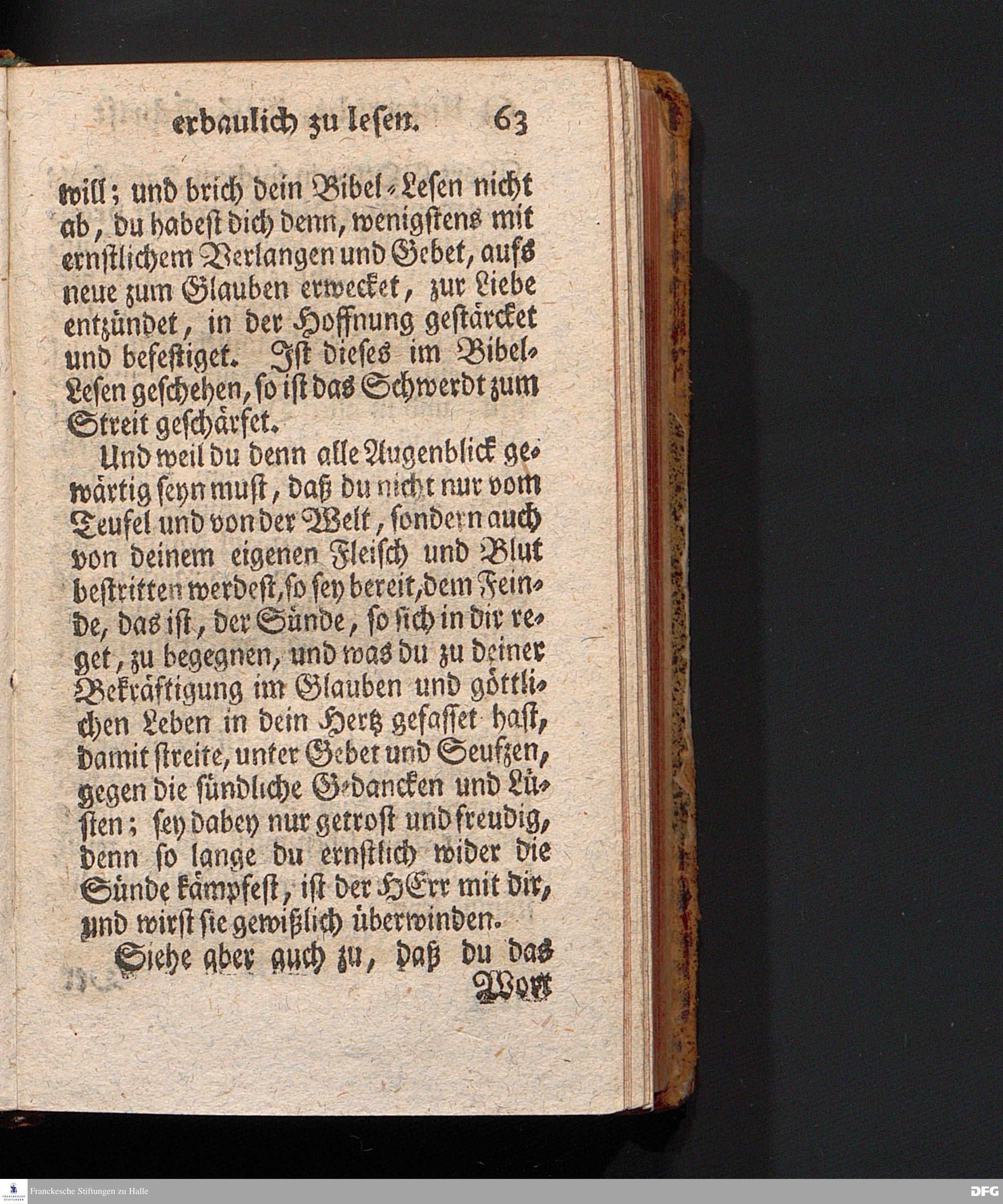 Die Lehre Vom Anfang Christliches Lebens, Bestehend in vier Theilen: I. In einer gründlichen Anleitung zu wahrer Busse und Glauben an GOTT. II. In einem einfältigen Unterricht, wie man die H.Schrift zu seiner wahren Erbauung lesen solle. III. In einer Schriftmäßigen Anweisung, recht und GOTT gefällig zu beten. IV. In einer kurtzen Prüfung, ob man den wahren lebendigen Glauben an CHristum habe oder nicht. Die XVI.Auflage. HALLE, In Verlegung des Wäysenhauses, 1740.