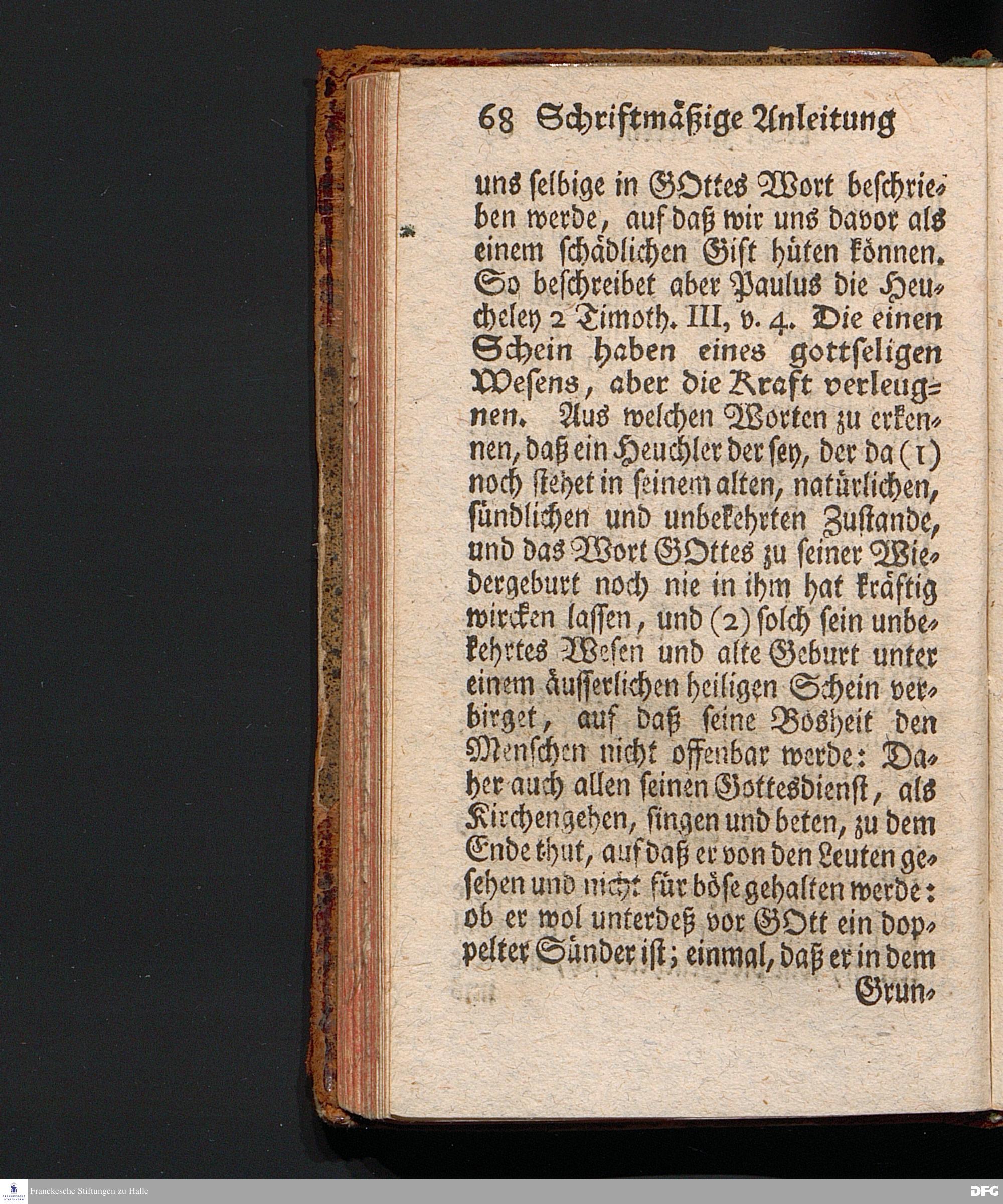 Die Lehre Vom Anfang Christliches Lebens, Bestehend in vier Theilen: I. In einer gründlichen Anleitung zu wahrer Busse und Glauben an GOTT. II. In einem einfältigen Unterricht, wie man die H.Schrift zu seiner wahren Erbauung lesen solle. III. In einer Schriftmäßigen Anweisung, recht und GOTT gefällig zu beten. IV. In einer kurtzen Prüfung, ob man den wahren lebendigen Glauben an CHristum habe oder nicht. Die XVI.Auflage. HALLE, In Verlegung des Wäysenhauses, 1740.