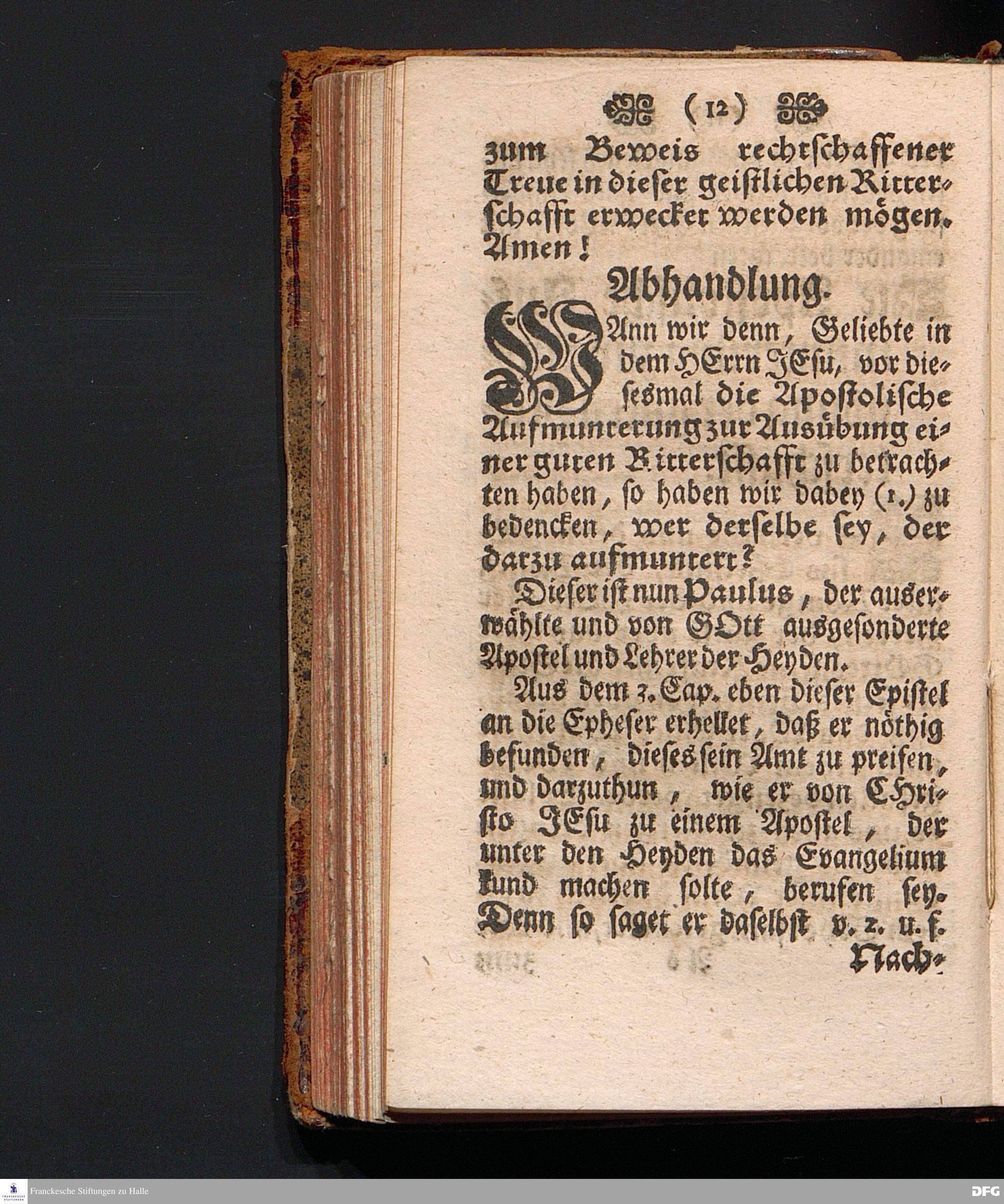 Die Apostolische Aufmunterung Zur Ausübung Der guten Ritterschafft / In einer Predigt Uber die Epistel Ephes.VI, 10-18. Am XXI.Sonntag nach Trinit. 1703. In der Schul=Kirche zu Halle vorgestellet Von August Hermann Francken / SS.Theol.Prof.Ord.Past.Vlr. & Schol. Andere Auflage. HALLE, Gedruckt im Wäysen=Hause Anno 1723.