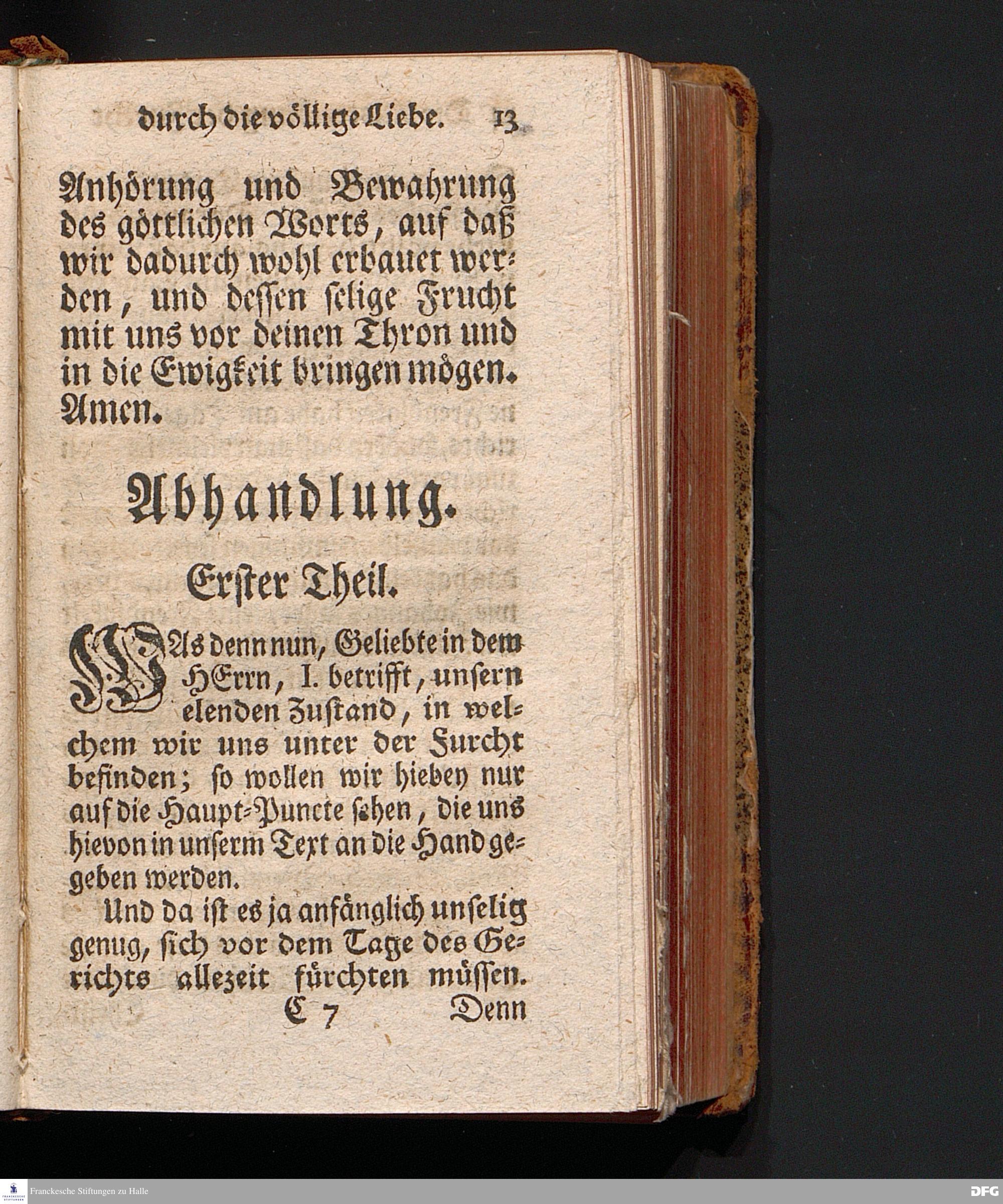 Die Austreibung Der Furcht durch die völlige Liebe, Am I.Sonntag nach Trinitatis 1719. In einer Uber die ordentliche Epistolische Lection aus I Joh.IV, 16-21. In der Universitäts=Kirche zu Leipzig auf geschehenen Antrag gehaltenen Predigt vorgestellet, und auf Begehren zum Druck gegeben, von August Hermann Francken, S.Theol.Prof.& Past.zu St.Ulrich, und des Gymnasii Scholarcha. Dritte Auflage. HALLE, in Verlegung des Wäysenhauses, 1743.