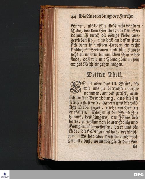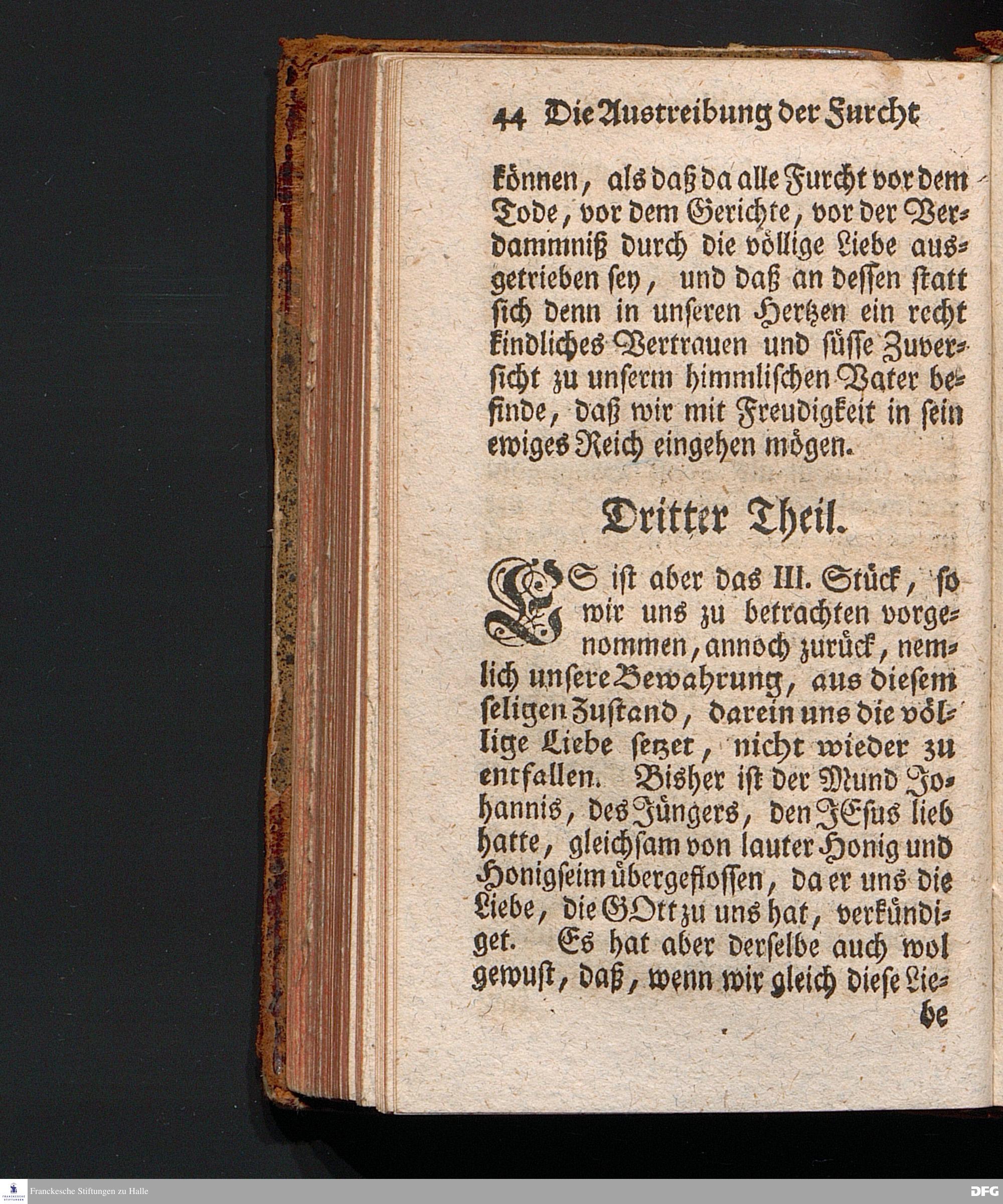 Die Austreibung Der Furcht durch die völlige Liebe, Am I.Sonntag nach Trinitatis 1719. In einer Uber die ordentliche Epistolische Lection aus I Joh.IV, 16-21. In der Universitäts=Kirche zu Leipzig auf geschehenen Antrag gehaltenen Predigt vorgestellet, und auf Begehren zum Druck gegeben, von August Hermann Francken, S.Theol.Prof.& Past.zu St.Ulrich, und des Gymnasii Scholarcha. Dritte Auflage. HALLE, in Verlegung des Wäysenhauses, 1743.