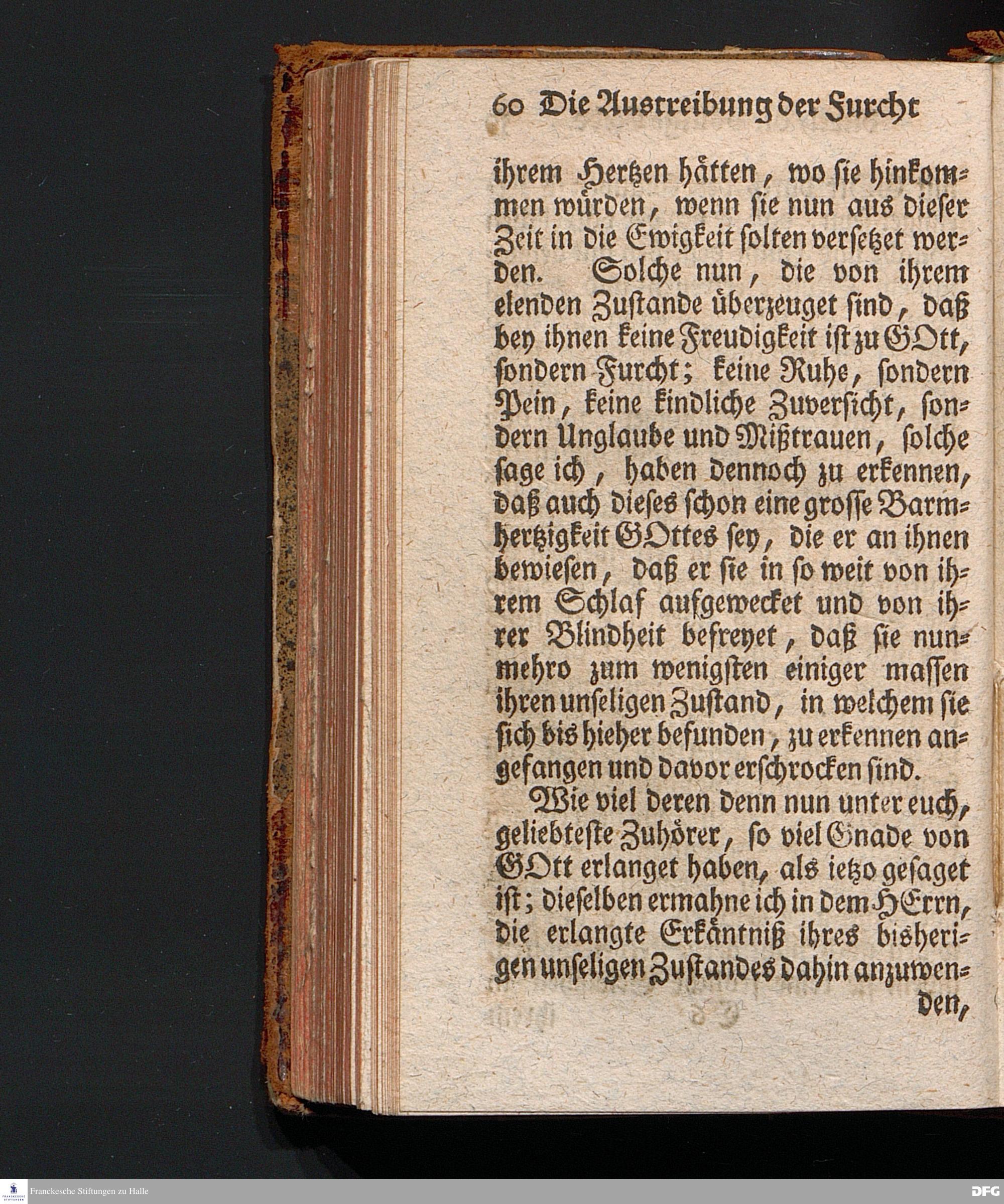 Die Austreibung Der Furcht durch die völlige Liebe, Am I.Sonntag nach Trinitatis 1719. In einer Uber die ordentliche Epistolische Lection aus I Joh.IV, 16-21. In der Universitäts=Kirche zu Leipzig auf geschehenen Antrag gehaltenen Predigt vorgestellet, und auf Begehren zum Druck gegeben, von August Hermann Francken, S.Theol.Prof.& Past.zu St.Ulrich, und des Gymnasii Scholarcha. Dritte Auflage. HALLE, in Verlegung des Wäysenhauses, 1743.