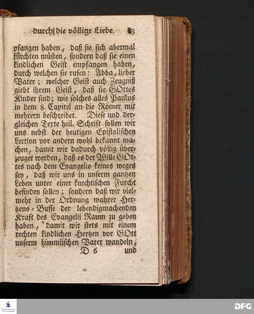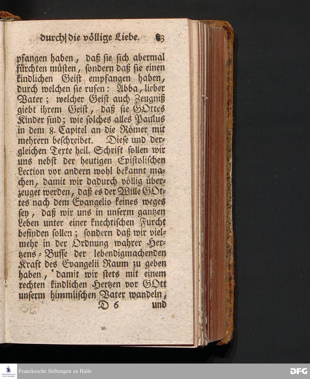 Die Austreibung Der Furcht durch die völlige Liebe, Am I.Sonntag nach Trinitatis 1719. In einer Uber die ordentliche Epistolische Lection aus I Joh.IV, 16-21. In der Universitäts=Kirche zu Leipzig auf geschehenen Antrag gehaltenen Predigt vorgestellet, und auf Begehren zum Druck gegeben, von August Hermann Francken, S.Theol.Prof.& Past.zu St.Ulrich, und des Gymnasii Scholarcha. Dritte Auflage. HALLE, in Verlegung des Wäysenhauses, 1743.