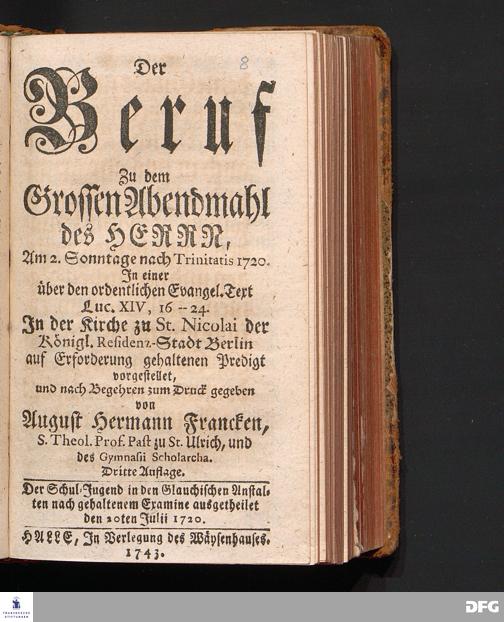 Der Beruf Zu dem Grossen Abendmahl des HERRN, Am 2.Sonntage nach Trinitatis 1720. In einer über den ordentlichen Evangel.Text Luc.XIV, 16--24. In der Kirche zu St.Nicolai der Königl.Residenz-Stadt Berlin auf Erforderung gehaltenen Predigt vorgestellet, und nach Begehren zum Druck gegeben von August Hermann Francken, S.Theol.Prof.Past.zu St.Ulrich, und des Gymnasii Scholarcha. Dritte Auflage. Der Schul=Jugend in den Glauchischen Anstalten nach gehaltenem Examine ausgetheilet den 20ten Julii 1720. HALLE, In Verlegung des Wäysenhauses. 1743.