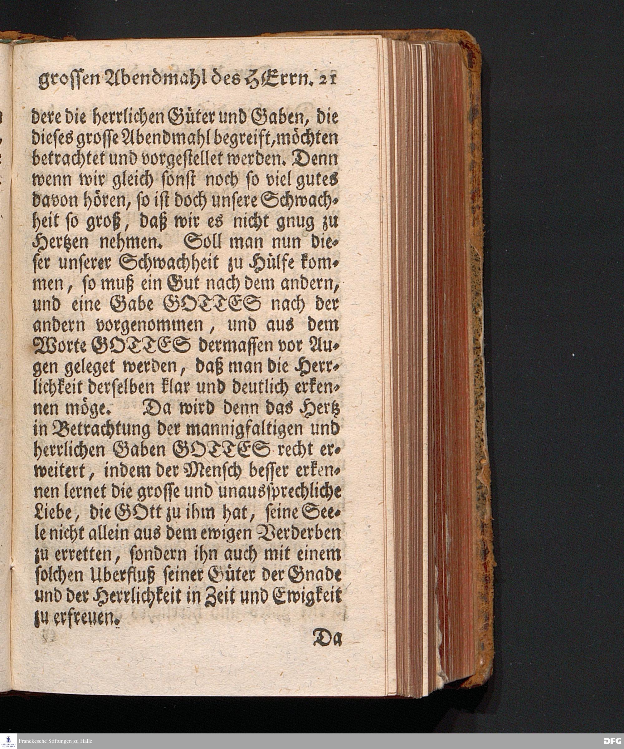 Der Beruf Zu dem Grossen Abendmahl des HERRN, Am 2.Sonntage nach Trinitatis 1720. In einer über den ordentlichen Evangel.Text Luc.XIV, 16--24. In der Kirche zu St.Nicolai der Königl.Residenz-Stadt Berlin auf Erforderung gehaltenen Predigt vorgestellet, und nach Begehren zum Druck gegeben von August Hermann Francken, S.Theol.Prof.Past.zu St.Ulrich, und des Gymnasii Scholarcha. Dritte Auflage. Der Schul=Jugend in den Glauchischen Anstalten nach gehaltenem Examine ausgetheilet den 20ten Julii 1720. HALLE, In Verlegung des Wäysenhauses. 1743.
