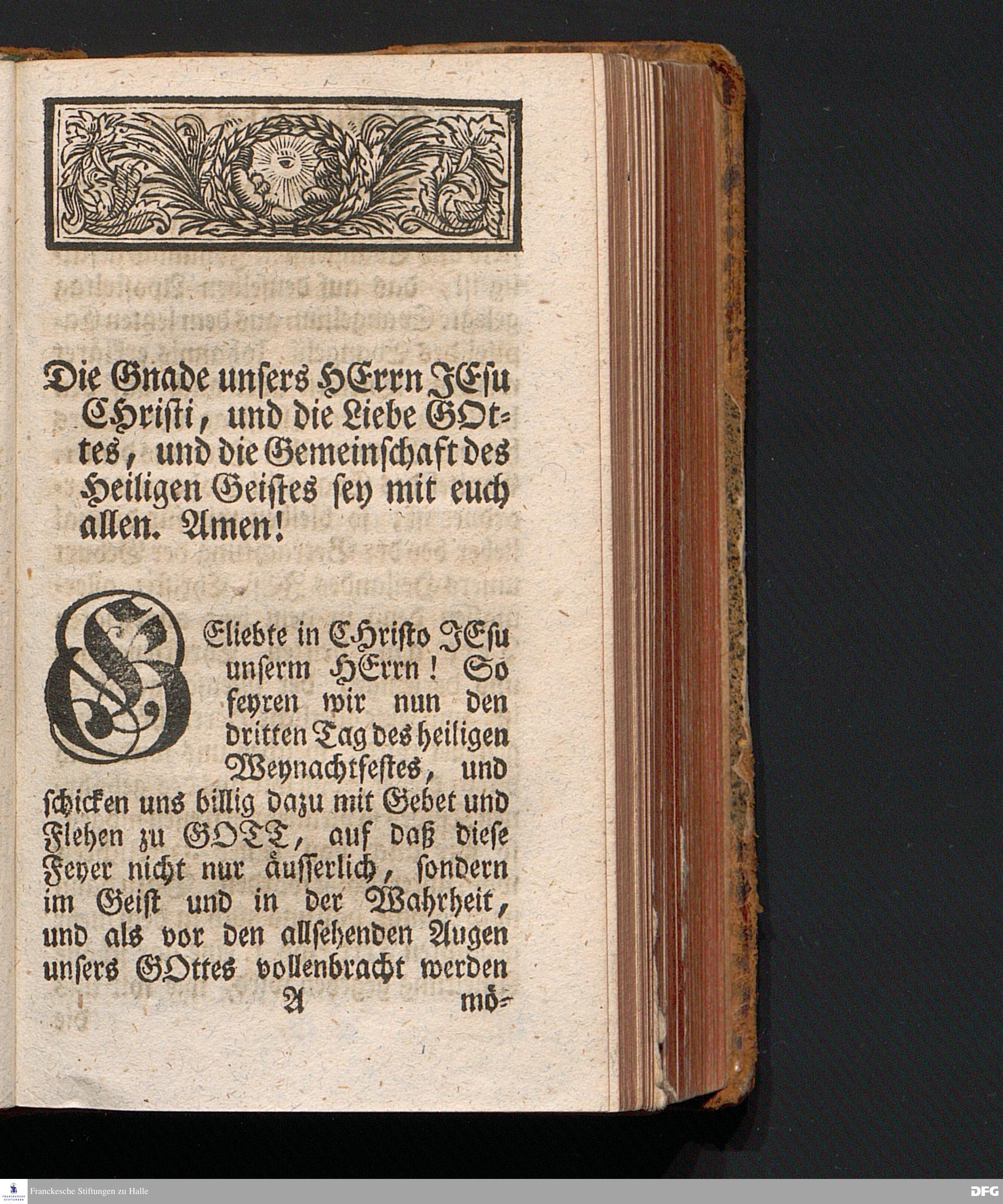 Christi Lust bey Uns, und Unsere Lust bey Christo, Am III.Christtage An.1717. In einer Uber den ordentlichen Evangelischen Text Joh.I, 1=14. In der Stadtkirchen zu Blaubeuren im Hertzogthum Würtemberg, Auf Erfordern Sr.Hochwürden des ietzigen Herrn Prälaten und gantzen Ministerii daselbst, gehaltenen Und auf Verlangen in den Druck gegebenen Predigt vorgestellet von August Hermann Francken, S.Theol.Prof.Past.und Scholarcha zu Halle im Hertzogthum Magdeburg. Zweyte Auflage. HALLE, verlegt im Wäysen=Hause, 1739.