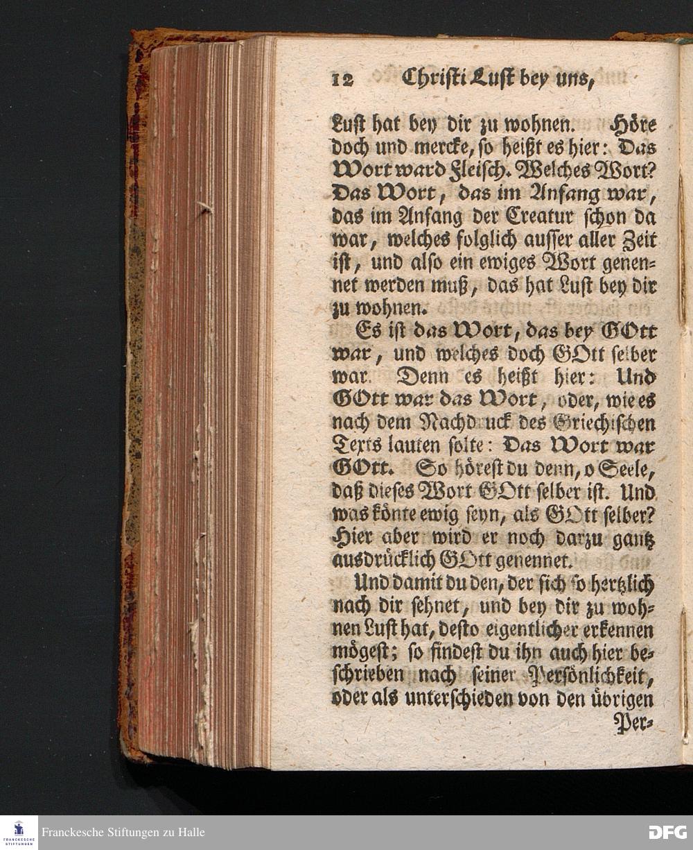 Christi Lust bey Uns, und Unsere Lust bey Christo, Am III.Christtage An.1717. In einer Uber den ordentlichen Evangelischen Text Joh.I, 1=14. In der Stadtkirchen zu Blaubeuren im Hertzogthum Würtemberg, Auf Erfordern Sr.Hochwürden des ietzigen Herrn Prälaten und gantzen Ministerii daselbst, gehaltenen Und auf Verlangen in den Druck gegebenen Predigt vorgestellet von August Hermann Francken, S.Theol.Prof.Past.und Scholarcha zu Halle im Hertzogthum Magdeburg. Zweyte Auflage. HALLE, verlegt im Wäysen=Hause, 1739.