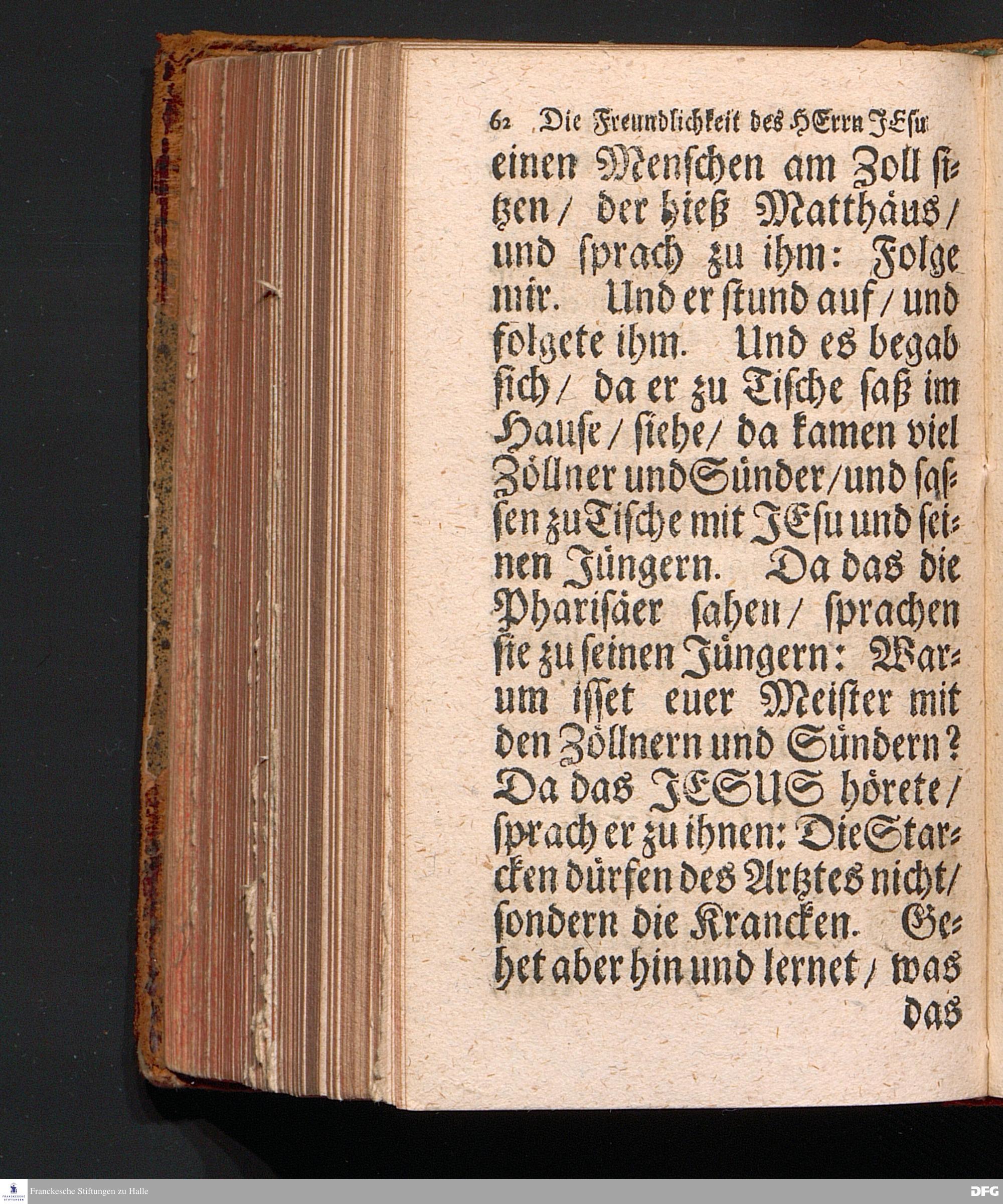 Die Freundlichkeit des HErrn JESU in Aufnehmung der Sünder / Am Tag des Apostels Matthäi 1717. Aus dem ordentlichen Evangelio Matth.IX, 9--13. In der Fürstl.Nassauischen Residentz Idstein bey der damaligen Durchreise in einer auf Verlangen gehaltenen Predigt vorgestellet von August Hermann Francken. [1720]