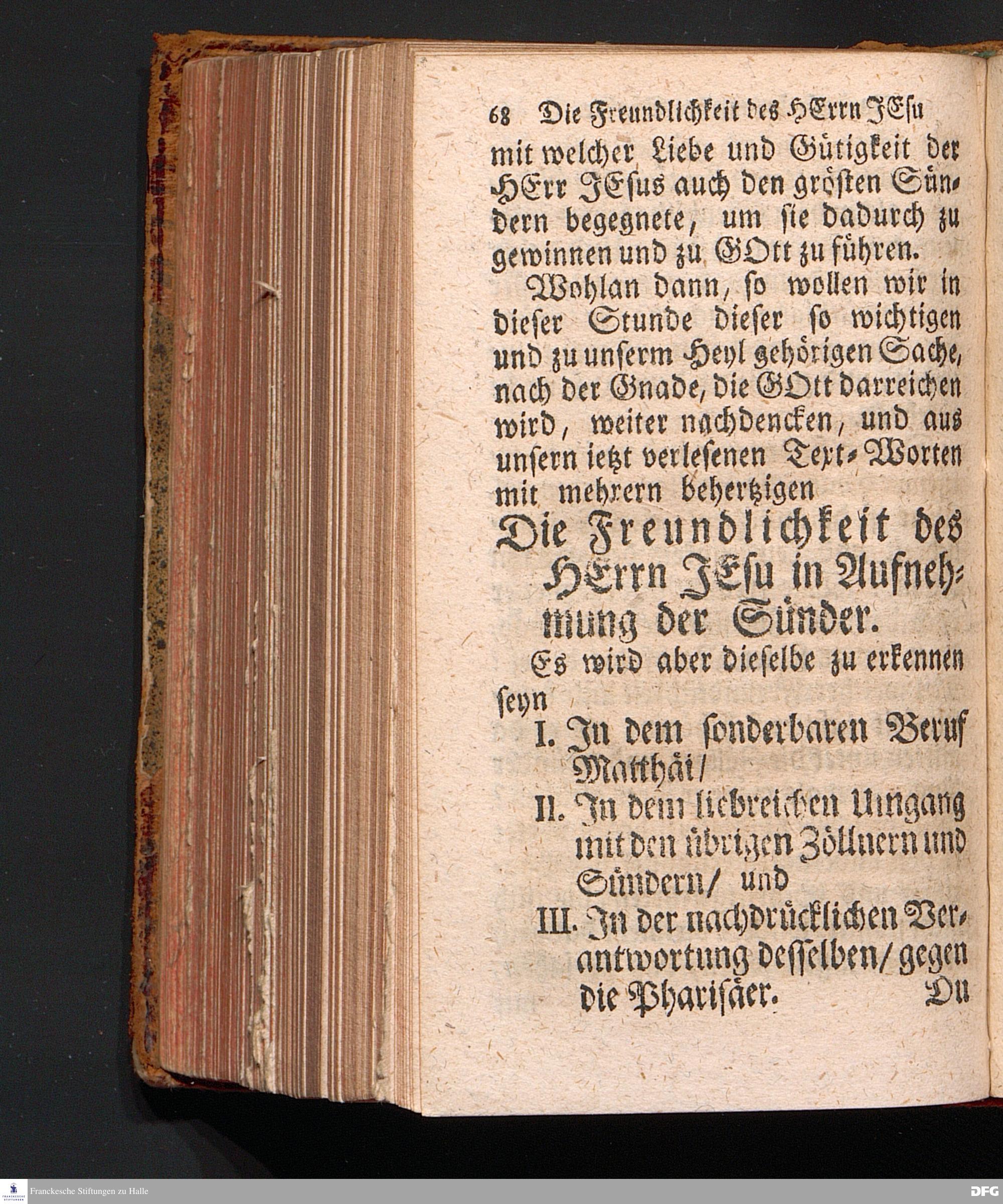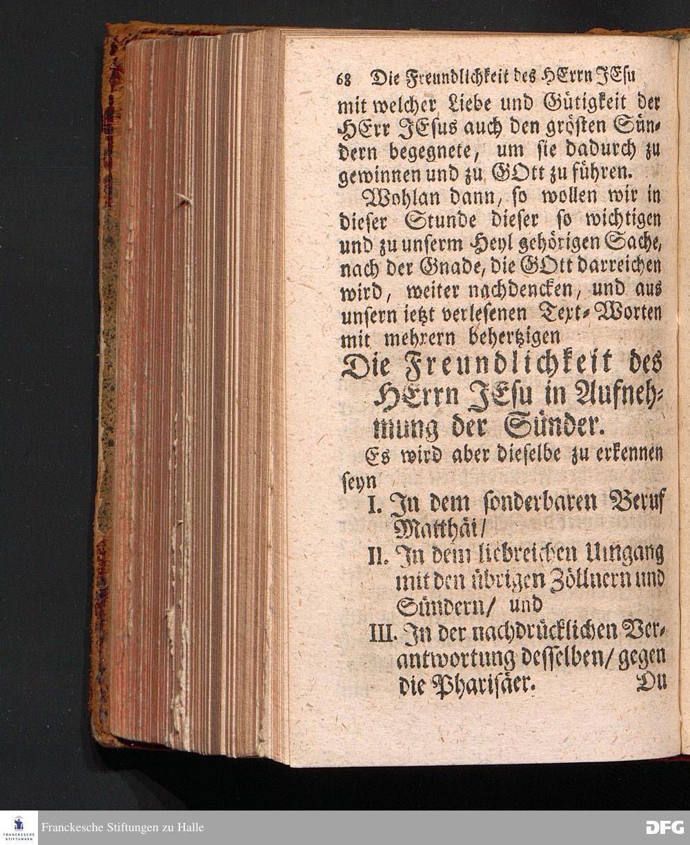 Die Freundlichkeit des HErrn JESU in Aufnehmung der Sünder / Am Tag des Apostels Matthäi 1717. Aus dem ordentlichen Evangelio Matth.IX, 9--13. In der Fürstl.Nassauischen Residentz Idstein bey der damaligen Durchreise in einer auf Verlangen gehaltenen Predigt vorgestellet von August Hermann Francken. [1720]