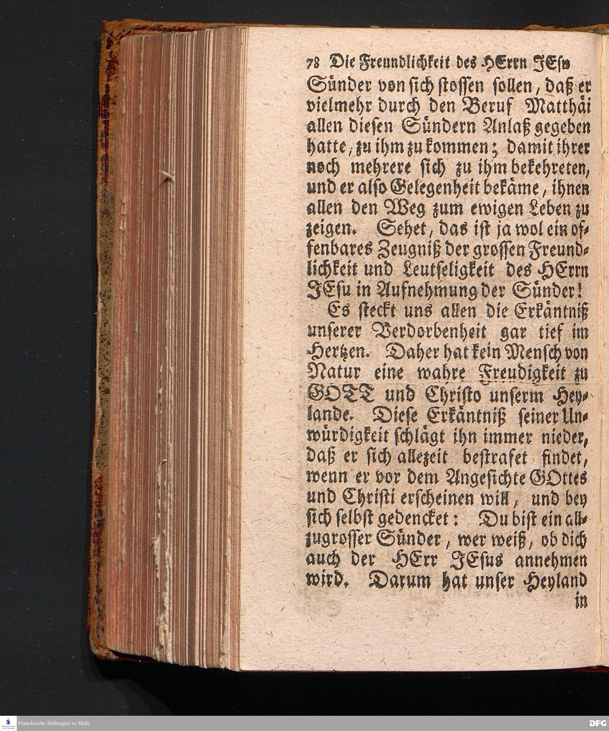 Die Freundlichkeit des HErrn JESU in Aufnehmung der Sünder / Am Tag des Apostels Matthäi 1717. Aus dem ordentlichen Evangelio Matth.IX, 9--13. In der Fürstl.Nassauischen Residentz Idstein bey der damaligen Durchreise in einer auf Verlangen gehaltenen Predigt vorgestellet von August Hermann Francken. [1720]