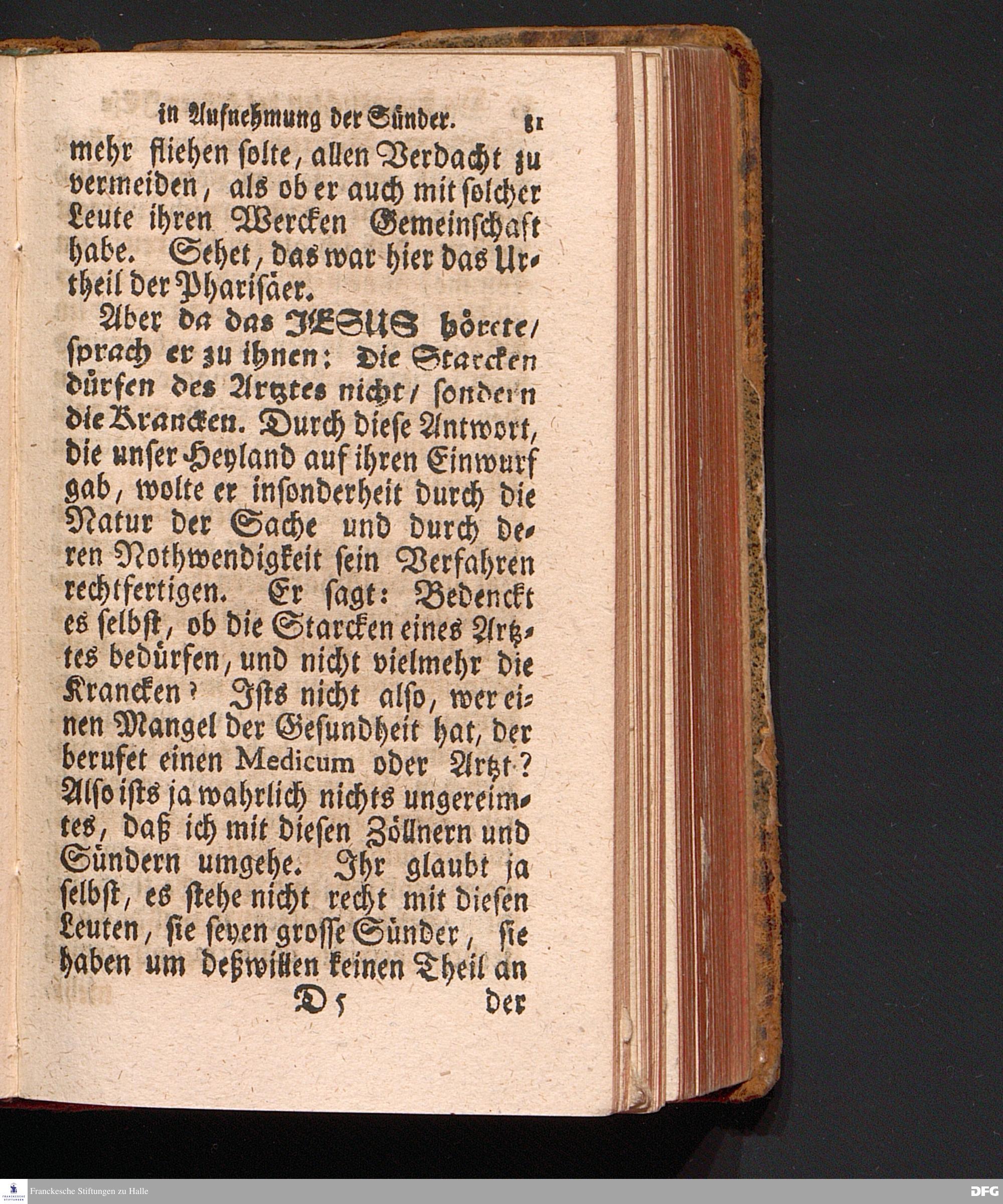Die Freundlichkeit des HErrn JESU in Aufnehmung der Sünder / Am Tag des Apostels Matthäi 1717. Aus dem ordentlichen Evangelio Matth.IX, 9--13. In der Fürstl.Nassauischen Residentz Idstein bey der damaligen Durchreise in einer auf Verlangen gehaltenen Predigt vorgestellet von August Hermann Francken. [1720]