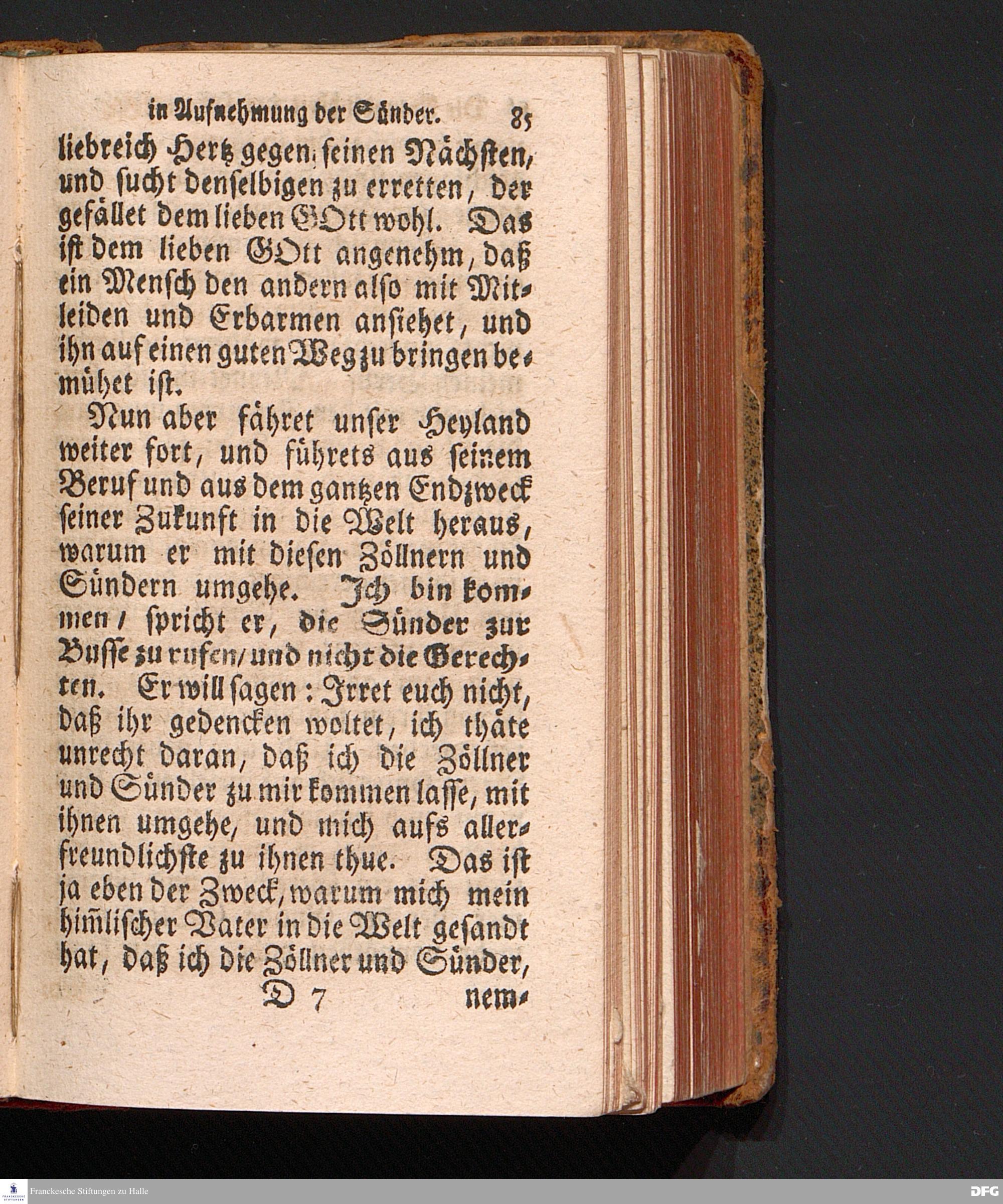 Die Freundlichkeit des HErrn JESU in Aufnehmung der Sünder / Am Tag des Apostels Matthäi 1717. Aus dem ordentlichen Evangelio Matth.IX, 9--13. In der Fürstl.Nassauischen Residentz Idstein bey der damaligen Durchreise in einer auf Verlangen gehaltenen Predigt vorgestellet von August Hermann Francken. [1720]