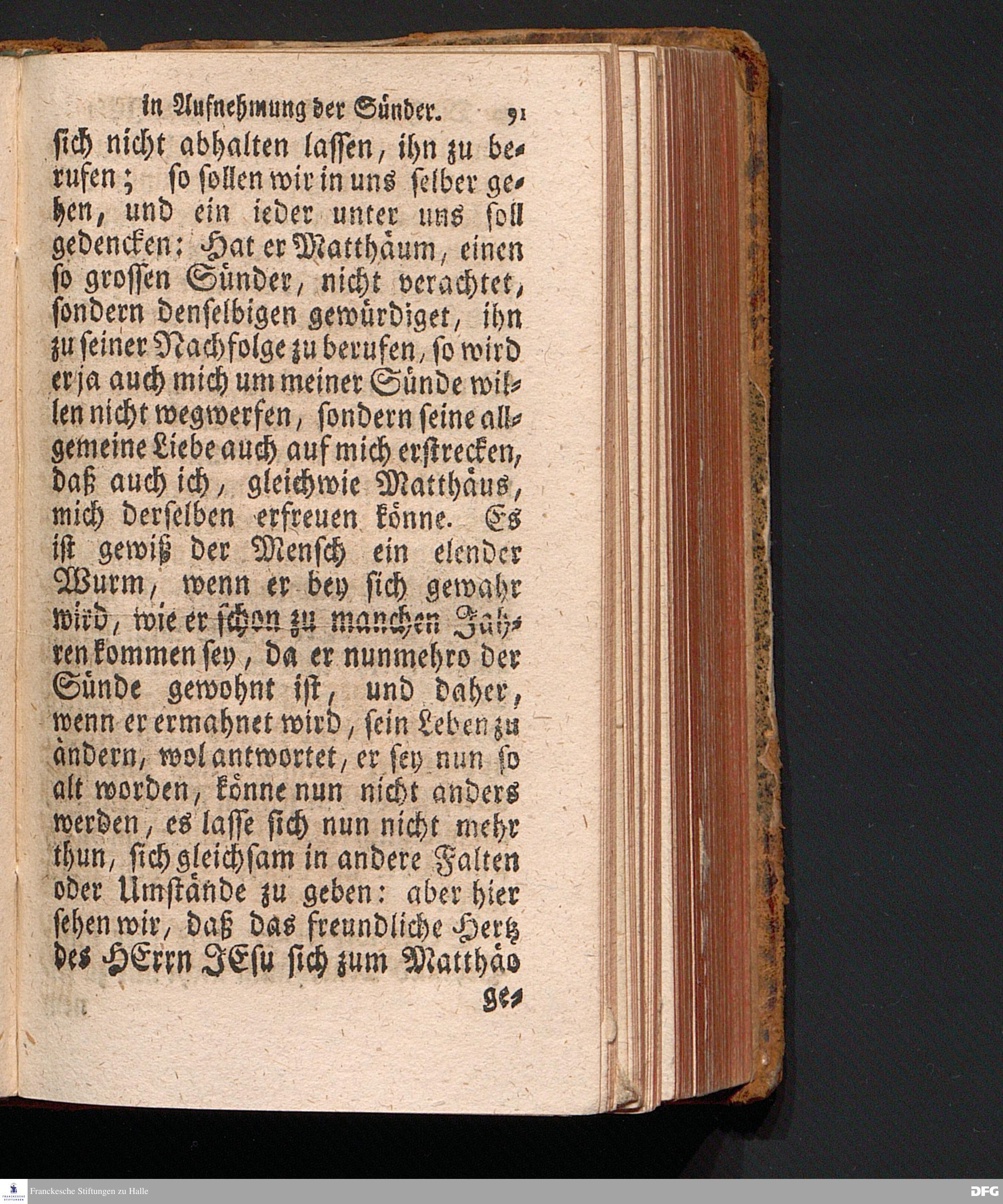 Die Freundlichkeit des HErrn JESU in Aufnehmung der Sünder / Am Tag des Apostels Matthäi 1717. Aus dem ordentlichen Evangelio Matth.IX, 9--13. In der Fürstl.Nassauischen Residentz Idstein bey der damaligen Durchreise in einer auf Verlangen gehaltenen Predigt vorgestellet von August Hermann Francken. [1720]